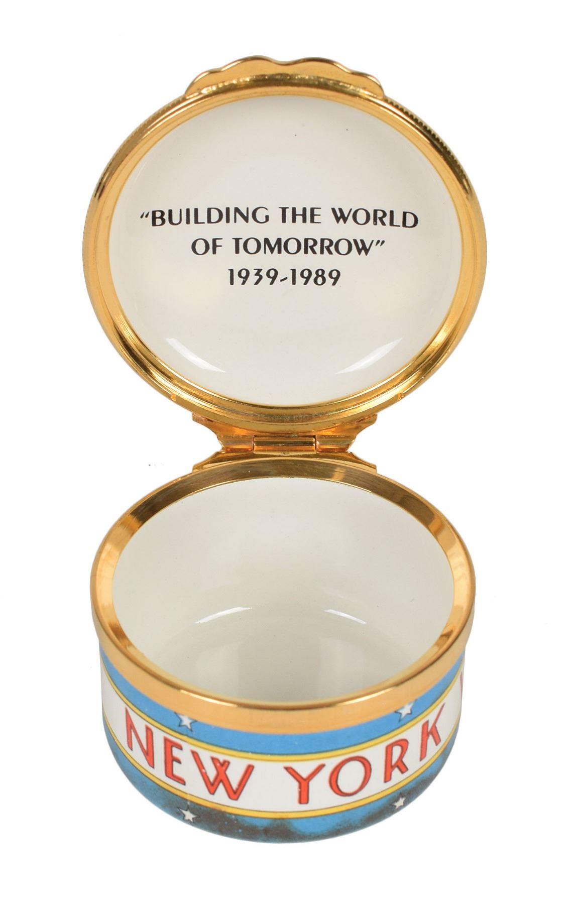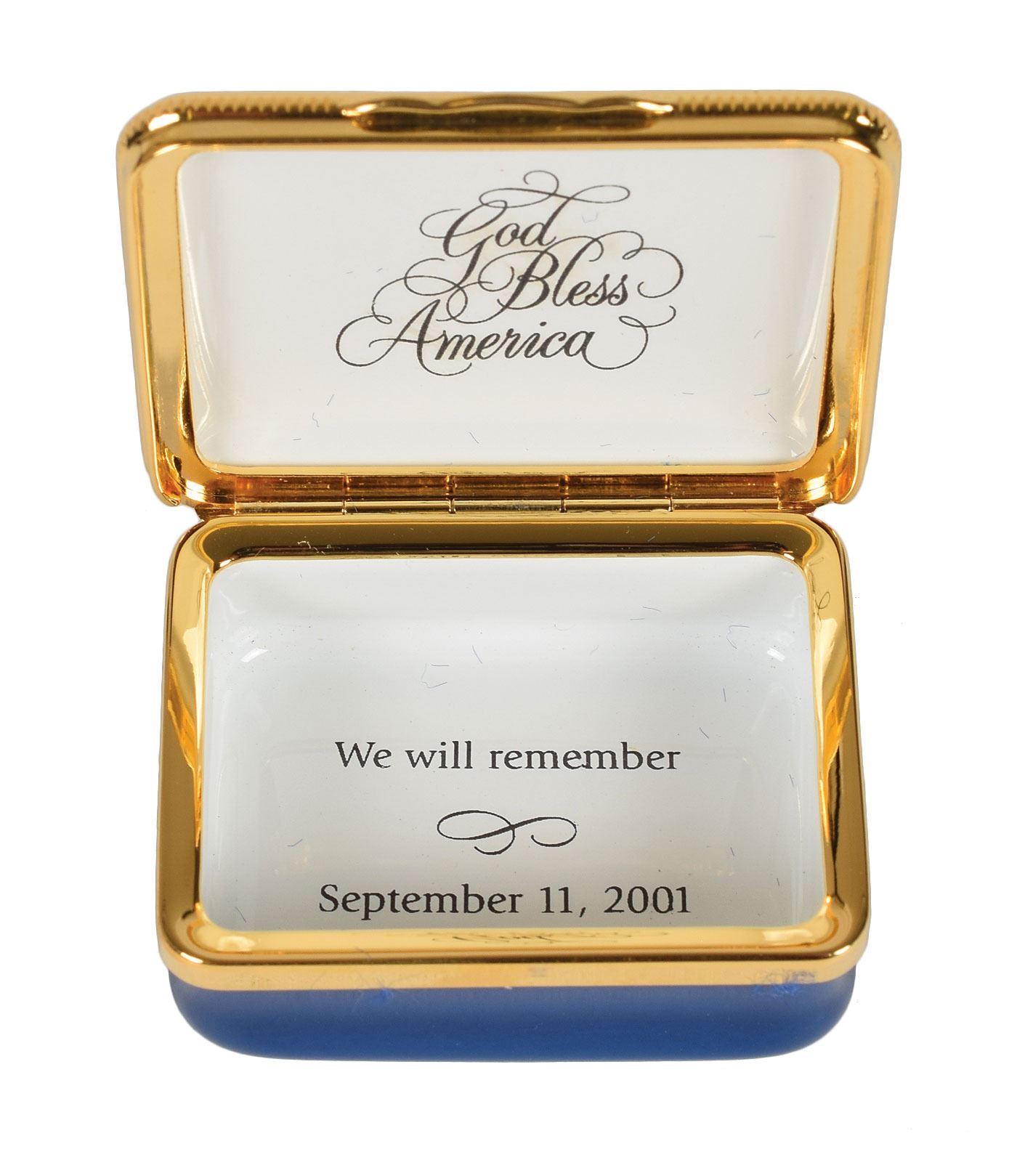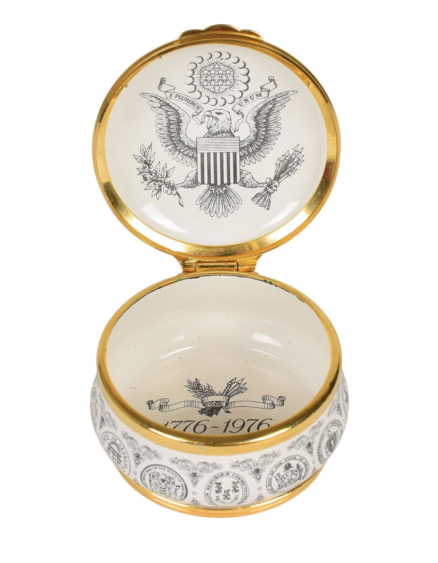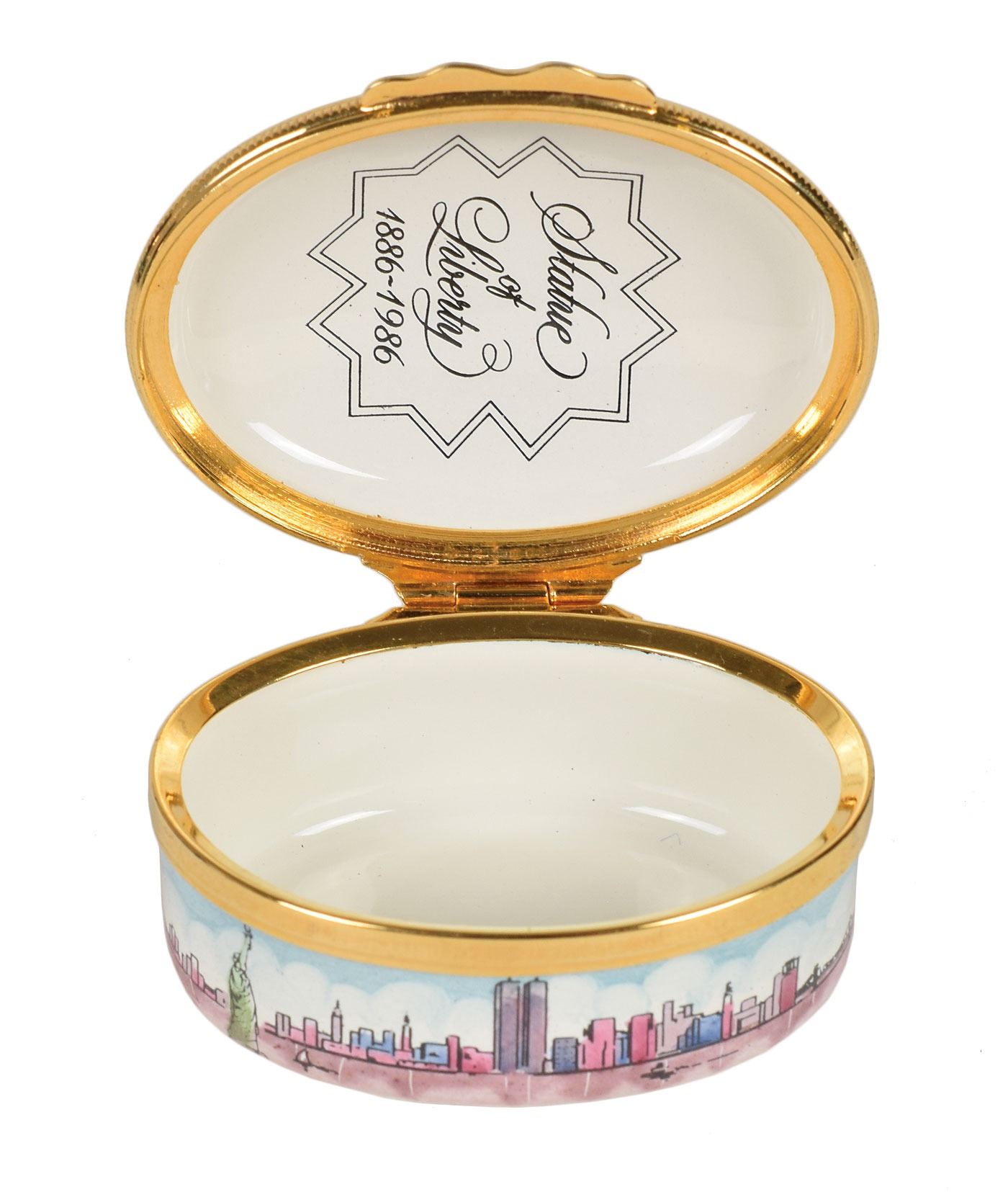 Group of four small enameled boxes honoring American history, including: a circular Bilston enamel trinket box by Cartier celebrating the bicentenary of the Declaration of Independence, measuring 2.5? in diameter and 1.25? tall; a circular enameled pill box by Halcyon Days of Bilston, England, honoring the 1939 World's Fair in New York, measuring 1.5? in diameter and 1? tall; an enameled trinket box honoring the Statue of Liberty, designed by Tiffany & Co. and made by Halcyon Days, measuring 2? x 1.5? x 1?; and a trinket box made by Halcyon Days, measuring 2? x 1.5? x .75?, depicting the American flag to honor September 11th. In overall fine condition. Accompanied by their original boxes.