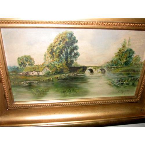 Is a nice American Impressionist painting oil/canvas signed below right and dated 1907. In good condition according to the age,back of the canvas was a repair spot. View of a country landscape with a river , a bridge and a farm. Size including the old frame: 20 " X 14"