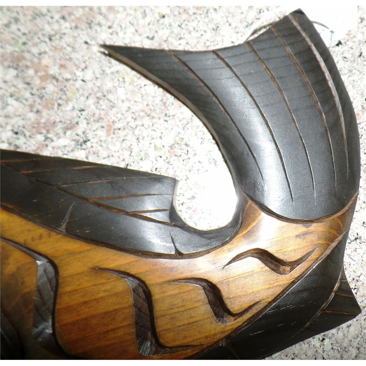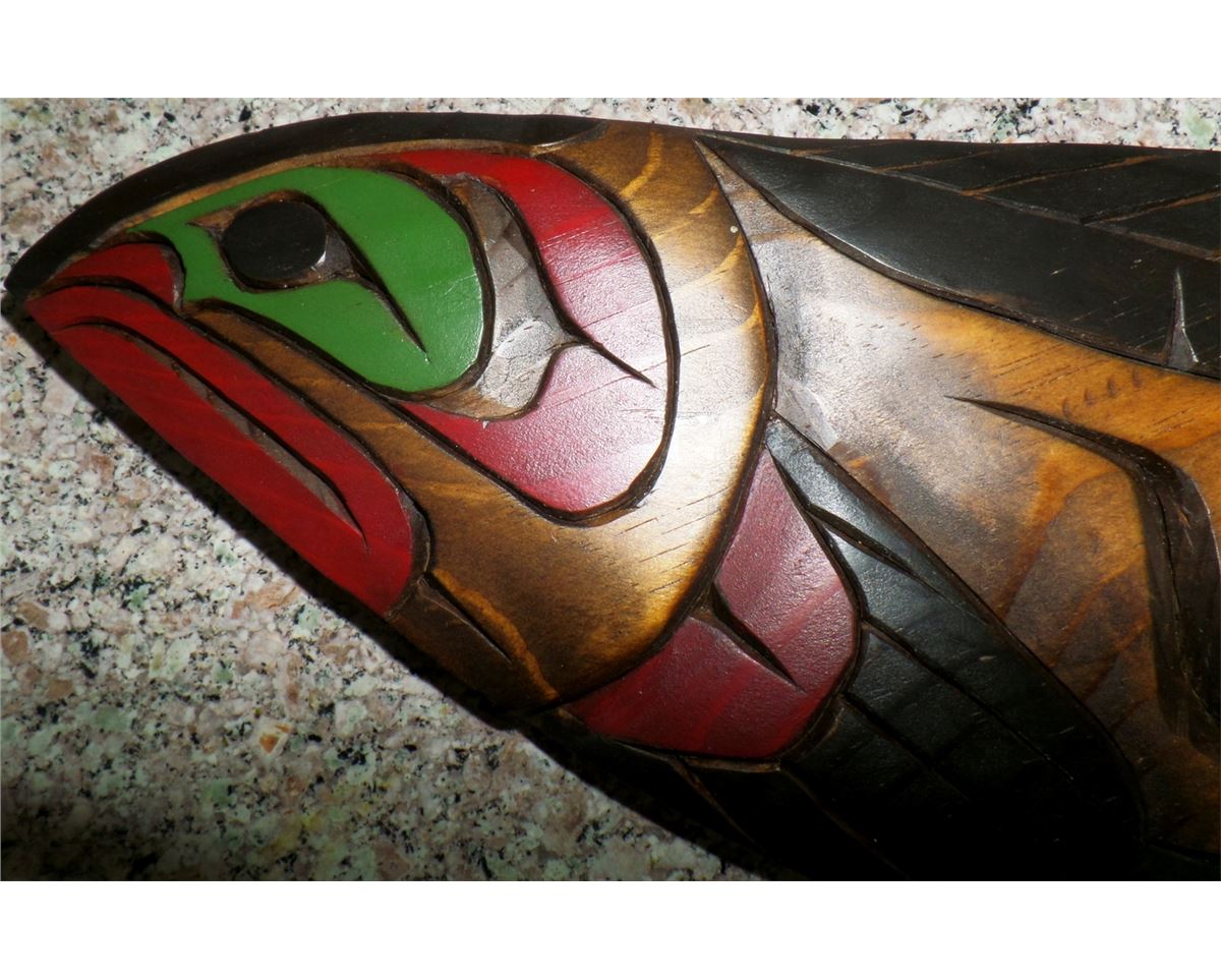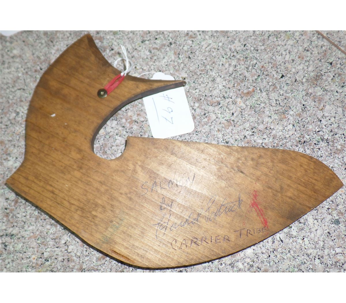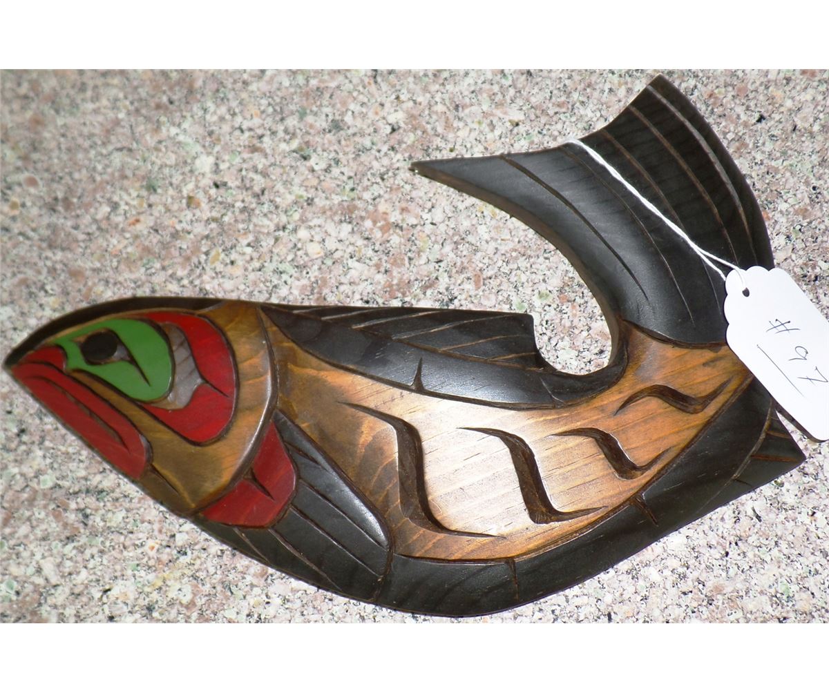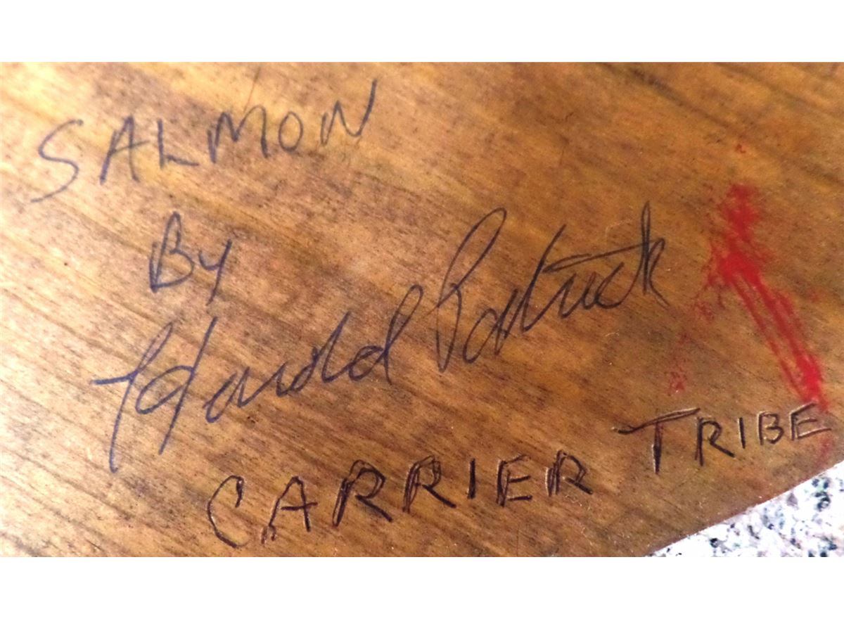 Very colorful paint and beautiful carving on this carved fish signed by Harold Patrick. The item is estimated from the 1950's and measures 12x8x1 inches and possibly the Carrier Tribe. It is in nice condition. Shipping $16.50