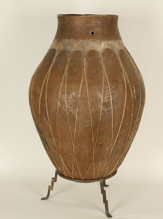 Large American Indian vessel with hide wrap. In good condition with one small hole and moderate loss at rim. Measures 27" x18" x18", includes metal stand.