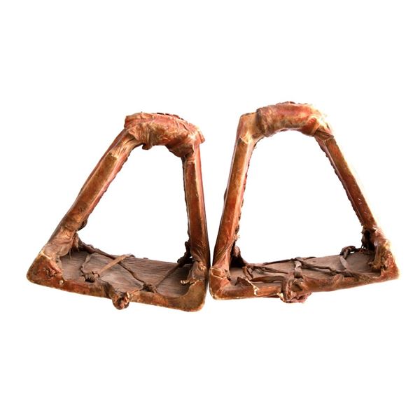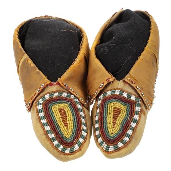 The lot features a set of hide beaded moccasins dating to circa 1850 from the Delaware Native American Indians. The set is comprised of Indian tanned