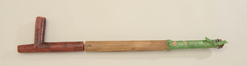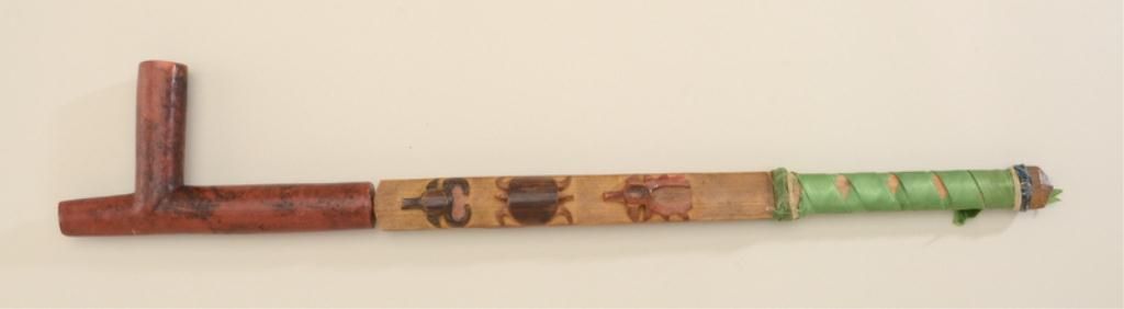 American Indian catlinite stone pipe with raised carved wood stem approx. 27” overall and approx. 9” long pipe with bowl standing approx. 5” high; smoking pipe appears to have age from use and wear and is in overall very good condition; wood carvings on stem are of a buffalo, turtle and deer with green ribbon wrap at the mouthpiece; a great looking piece! Est.: $1,500-$3,000.
