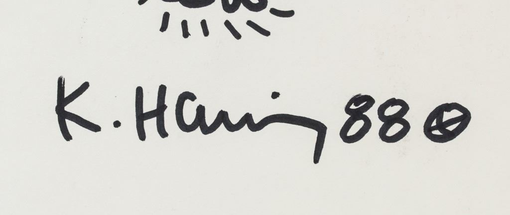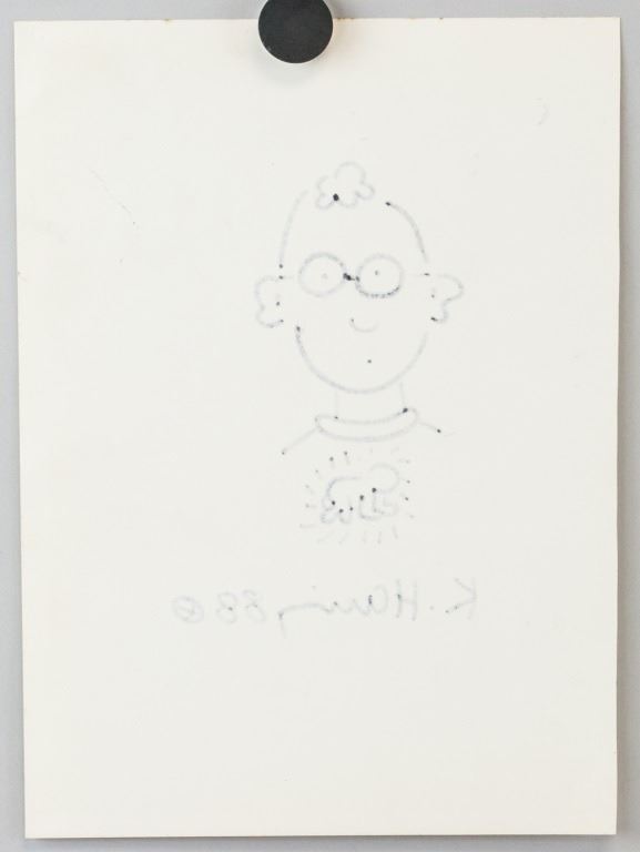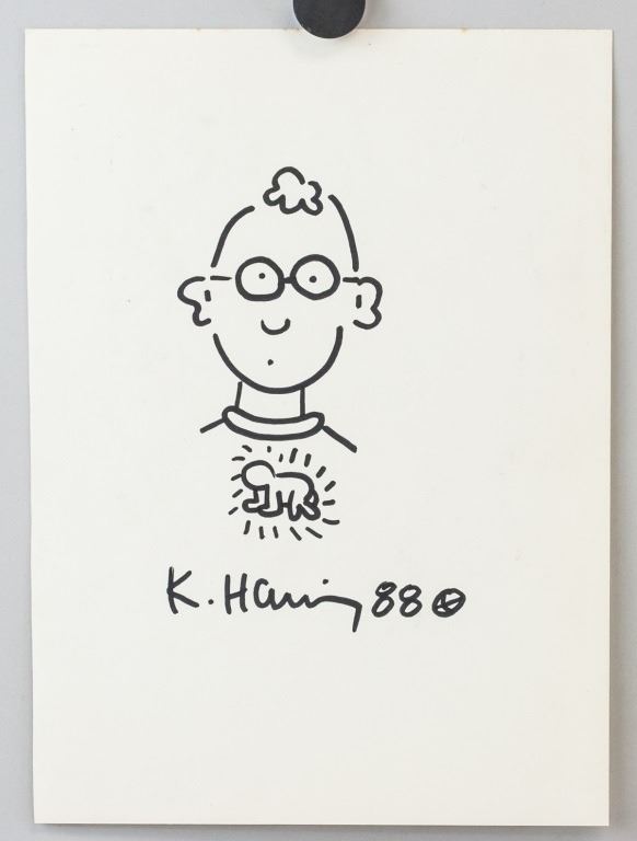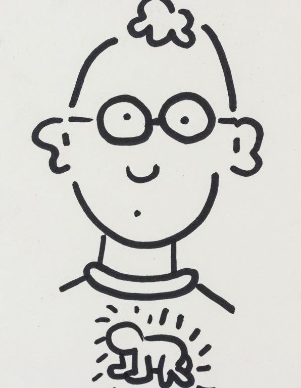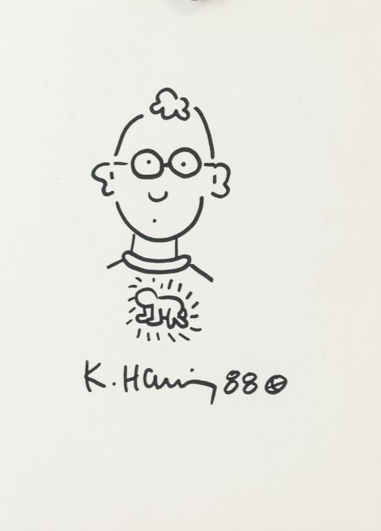 Ink on paper. Featuring cartoon portrait of a boy with glasses. A crawling baby drawn beneath. Signed "K. Haring" beneath the images. "88" inscribed beside the signature. 27.5 x 20 cm (10.75 x 8 in)