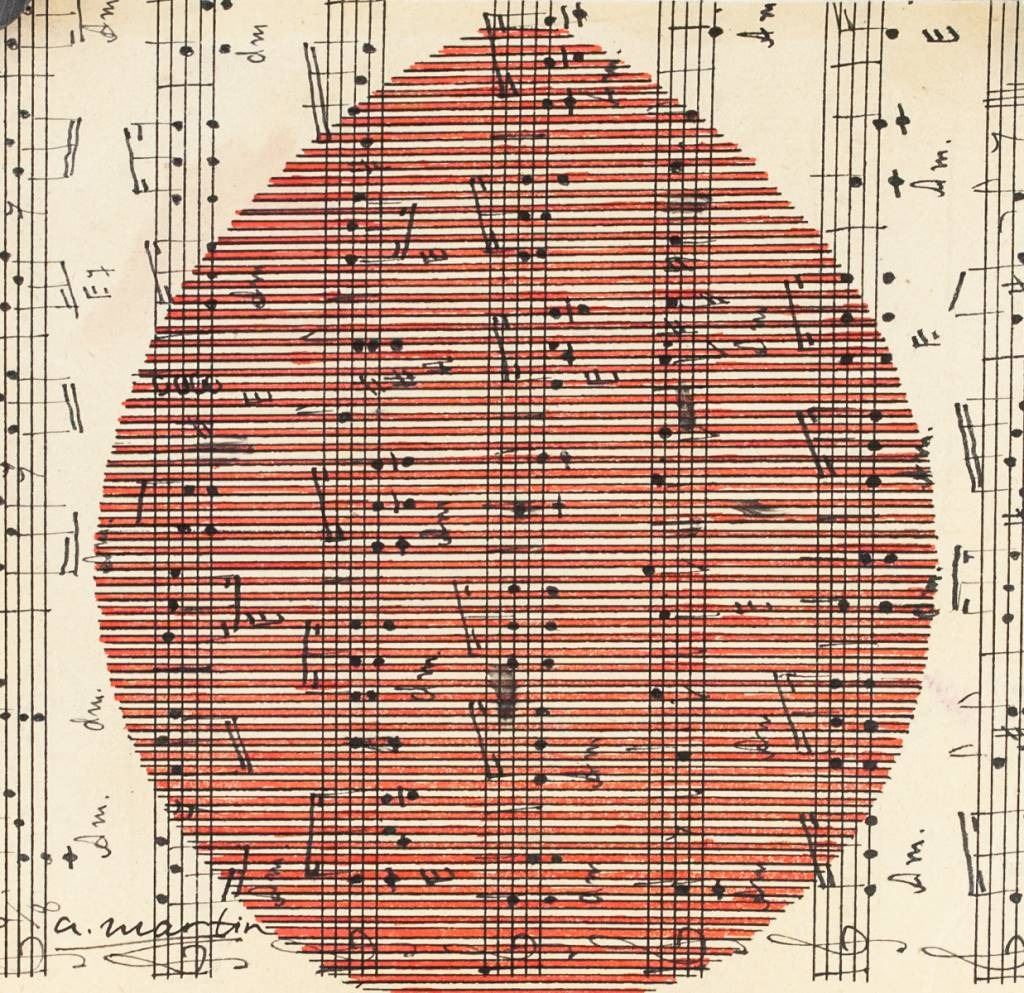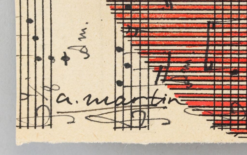 Ink on paper. Featuring large tear drop shape on sheet music. Signed "a. martin" in the bottom left corner. Illegible stamp and label on verso. 14.7 x 15.5 cm (5.75 x 6 inches).