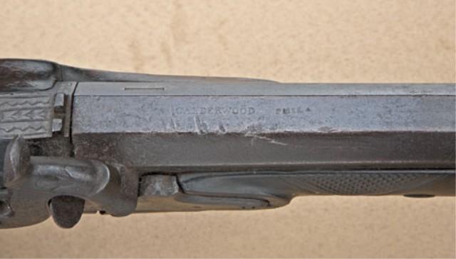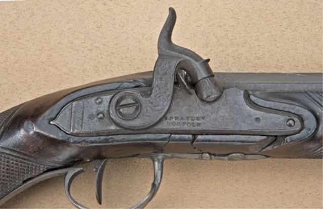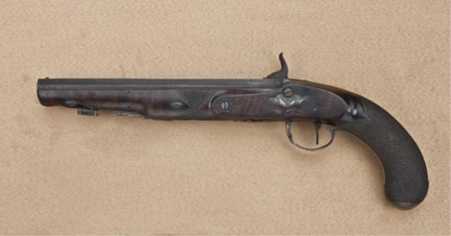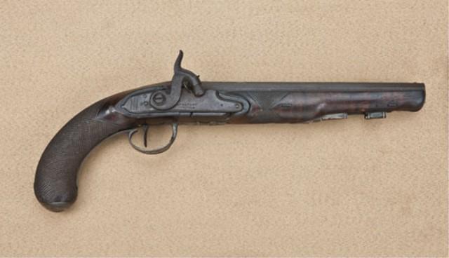 American Kentucky-style flintlock pistol converted to percussion, marked “S. Pratley, Norfolk” and “Calderwood, Philadelphia” on barrel. The pistol measures 15-1/4” overall, with 9” medium to slightly heavy octagon barrel of approx. .52 caliber smoothbore. Full stocked to the muzzle and nicely striped walnut with checkered forend and wrist and coin silver engraved mounts. The metal surfaces are a dark brown patina with light to moderate scattered erosion and pinprick pitting. The front sight shows darkened silver inlays around the front sight which is a classic American motif. The escutcheon around rear lockplate screw is nicely engraved with arrows. The buttcap and triggerguard are lightly engraved and the triggerguard shows a pineapple finial. The ramrod pipes are silver and show dents. The lock is nicely converted to percussion with engraved hammer and bolster. The breech and hammer shows some pitting, the metal surfaces are generally good and very dark, the stock shows some breaks and losses in the forend near the muzzle and some cracks with losses of wood on the bottom side of the lock. The balance of the stock is good and would restore nicely. A high quality silver