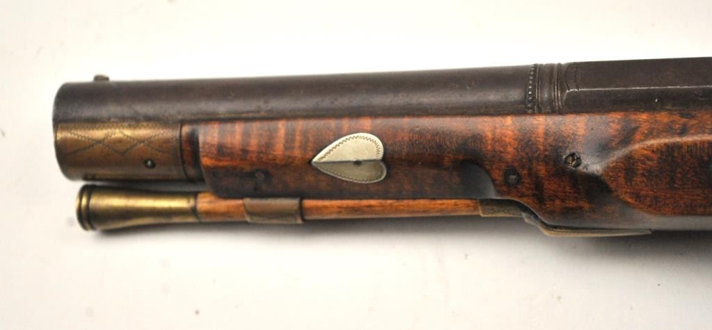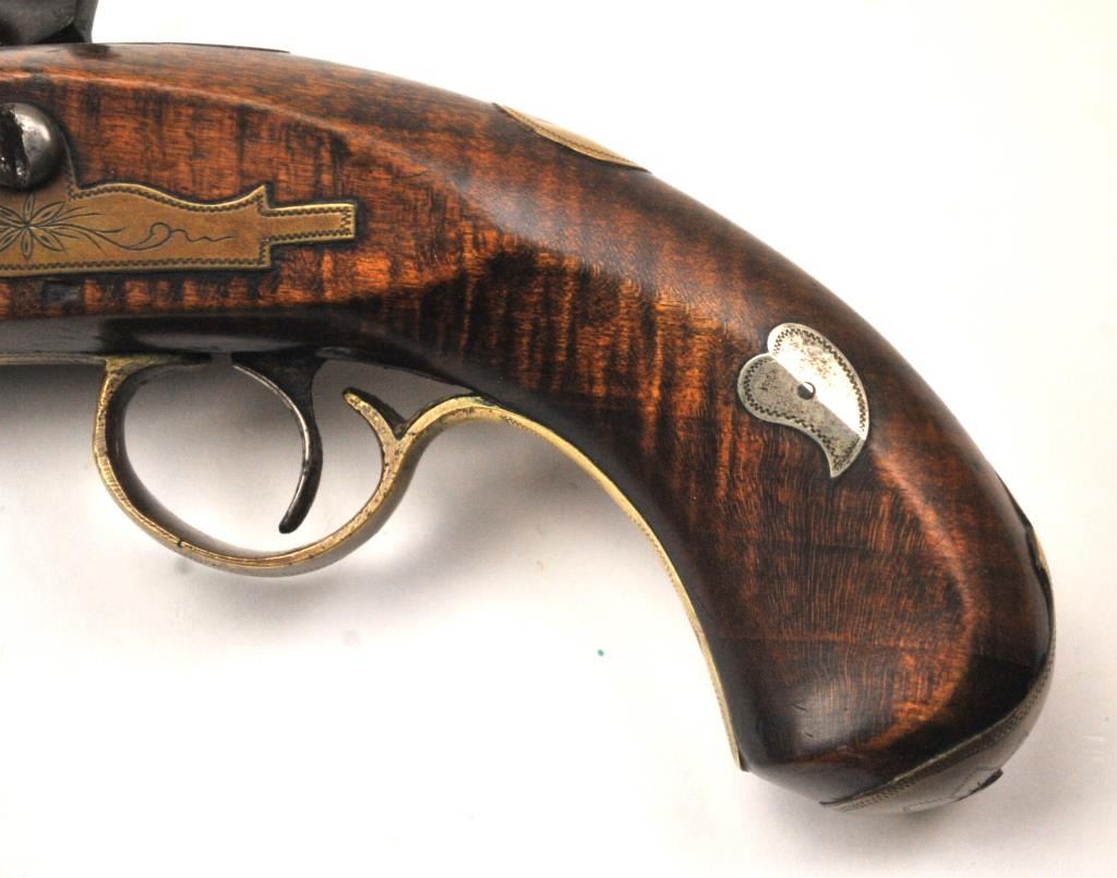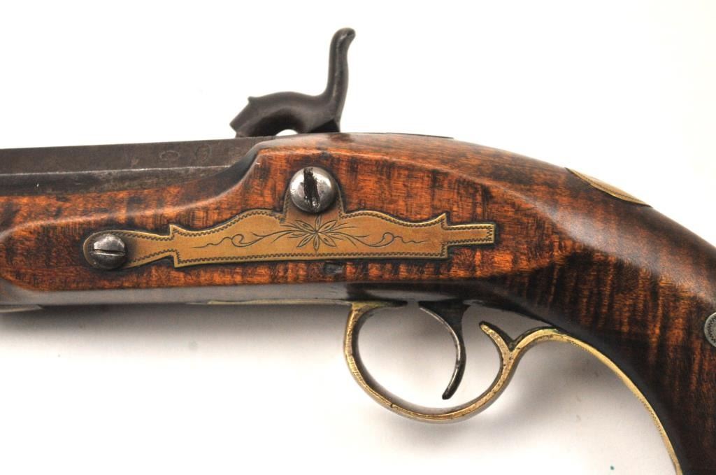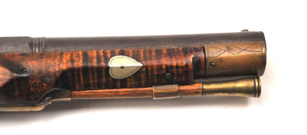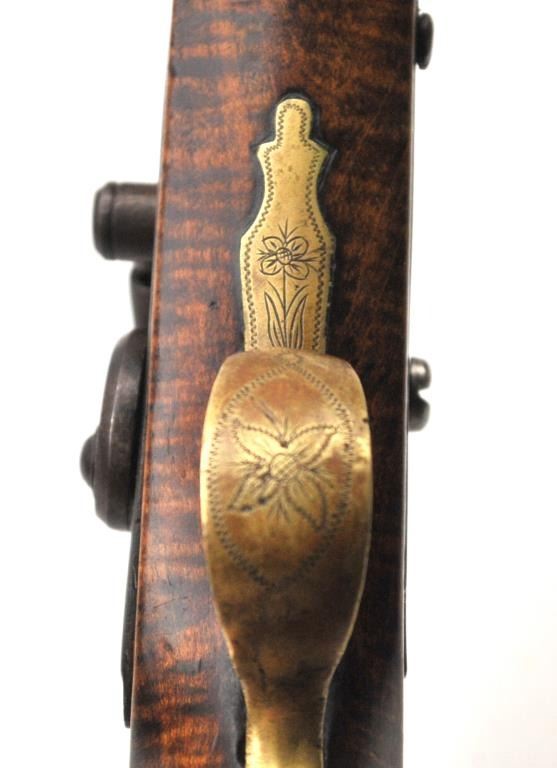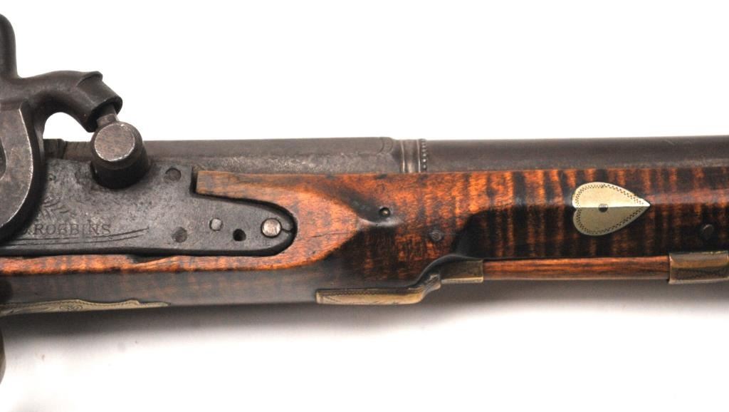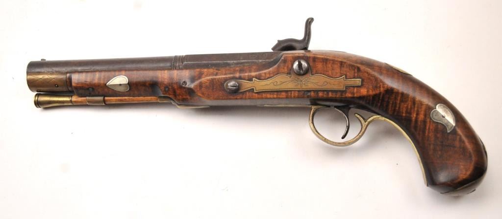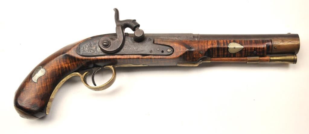 American Kentucky style pistol with a lock signed C. Robbins (converted from flintlock to percussion). The barrel is marked London and T.K. (Thomas Ketland) with V.P. proofs with silver “star” around the front sight.The pistol is approximately 13 5/8” in overall length with an 8 ¼” barrel of approximately .60 caliber smoothbore. The natural striped Walnut stock with lightly engraved American florals in a Pennsylvaniastyle with four heart shaped silver inlays. The pistol has very good metal with a nice stock showing minor losses around the bottom edge of the lock. The gun is in very good plus overall condition with natural aging,marked C. Robbins. Est.: $1,000-$2,000.
