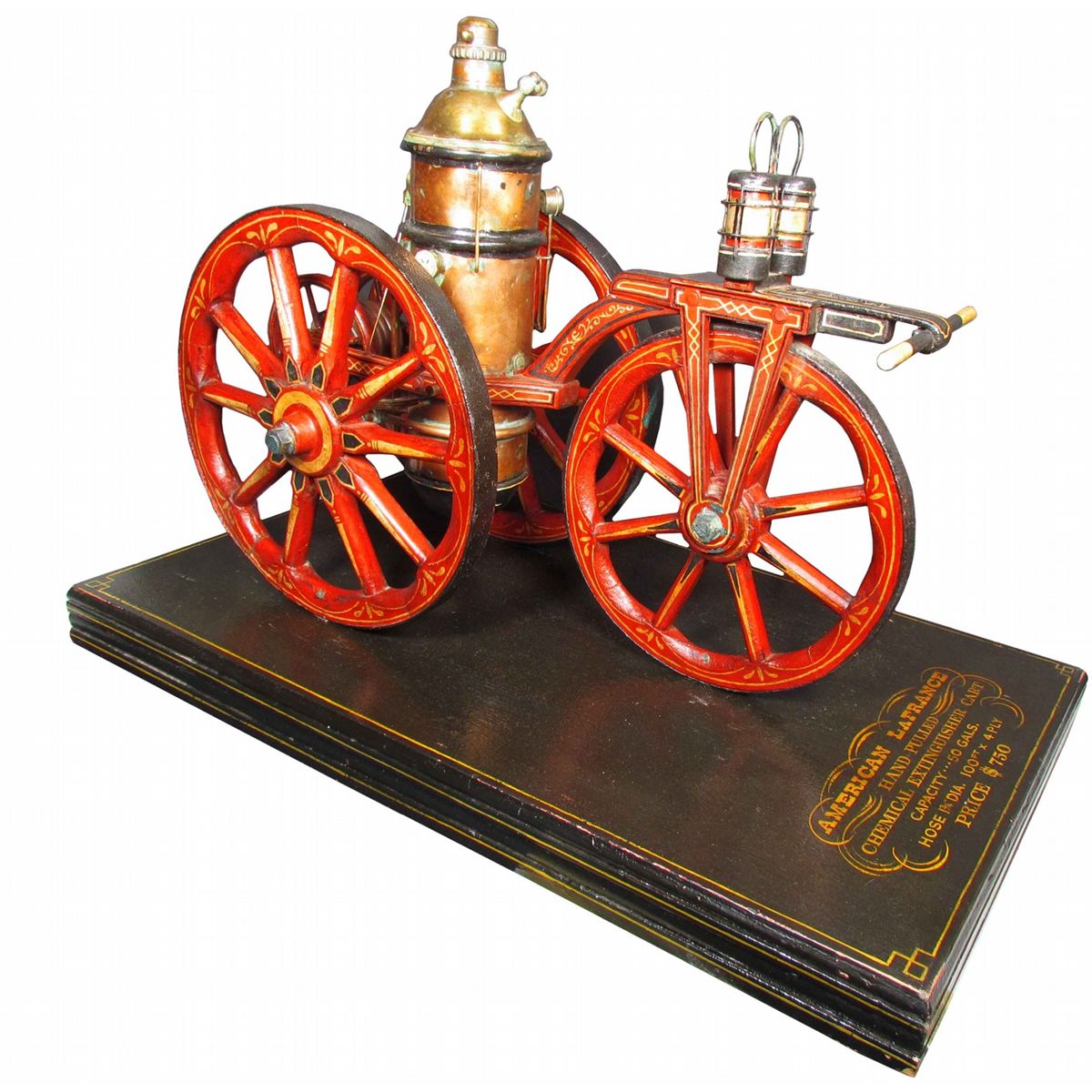 American LaFrance Representation Model of Hand Pulled Chemical Extinguisher. Hand carved wood. Purported to have been built by the Elder Brothers of Bronx, NY. Excellent condition. 32 1/2 X 20 X 19 inches.