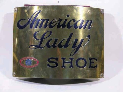 American lady shoe brass corner sign, Hamilton Brown Shoe Co. 18" x 14", ex. cond.