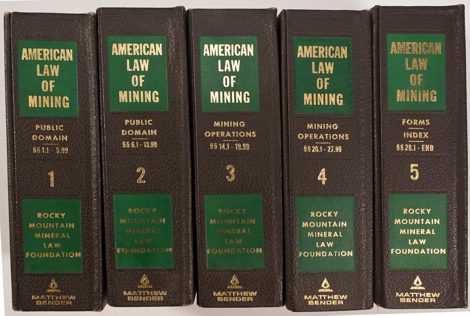 Lot of 5. Edited by the Rocky Mountain Mineral Law Foundation and published by Matthew Bender, 1960-1973. The purpose of these books was to update and supplement the previous editions of the books. All volumes are black binders with green and gold-colored lettering on both front and spine. Volume 1 contains Titles I-V: Sources and Evolution of American Mining Law; Mineral Development of Federal Public Domain; Acquired and Reserved Lands; Development of Federally Reserved Minerals in Fee Lands; Prospecting and Discovery; and Location of Mineral Deposits. 906 pages. Volume 2 contains Titles VI-XI, XIII: Rights Conferred by Location; Maintenance of Claim after Location; Abandonment, Forfeiture and Relocation ; Patents and Adverse Claims; Federal Mineral Leases; Mining Titles; and Comparative Mining Laws of Foreign Countries. 916 pages. Volume 3 contains Titles XIV-XIX: Exploration Contracts; Conveyancing and Status of Mineral Interests; Coal Leases; Royalty Interest and Ore Payments; Operating Agreements; and Labor. 844 pages. Volume 4 contains Titles XX-XXVII: Radiation Exposure; Liabilities Incident to Mining and Milling Operations; Co-Ownership of Mining Properties and Mining Partnerships; Mining Companies Government Support to Mining; Ore Marketing; Valuation of Mining Properties; and Ad Valorem and Production Taxation of Mining Properties. 764 pages. Volume 5 contains Titles XXVIII-XXX: Mineral Income Taxation; Liens and Encumbrances; and Solid Mineral Leases. 384 pages. Volume 5 also contains forms and the index, pages 1001-2062. The Cumulative Pocket Supplement for Idaho Code, Volume 8, 1973, is also included. It is a photocopy of the supplement stapled at the top left. Pages 317-351 only.