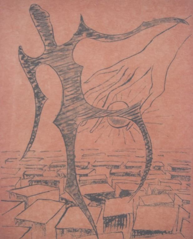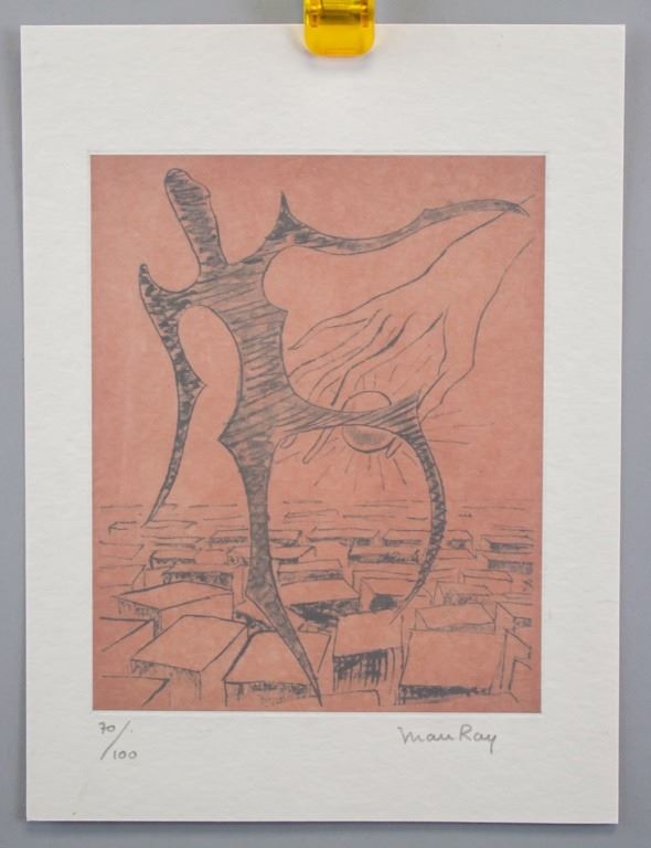 Linocut etching on paper. Featuring a figure inset atop boxes. Signed Man Ray and inscribed 70/100 on the lower right and lower left corner, respectively. 28 x 21 cm (11 x 8.3 inch)