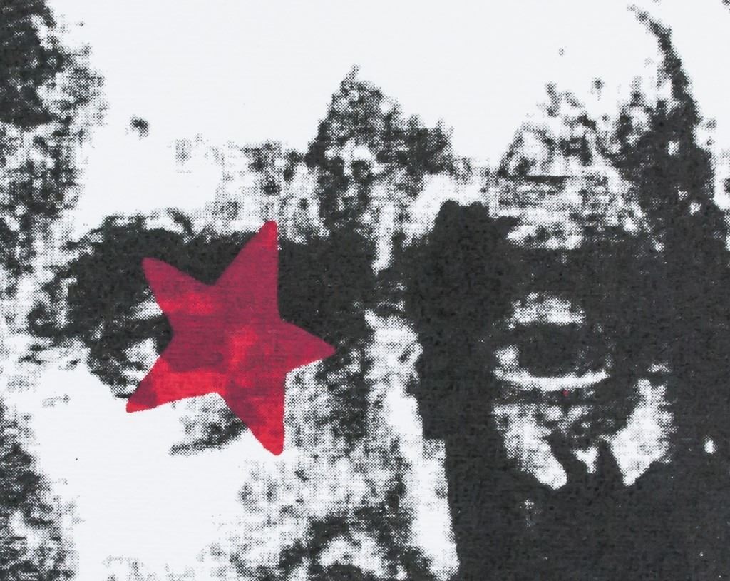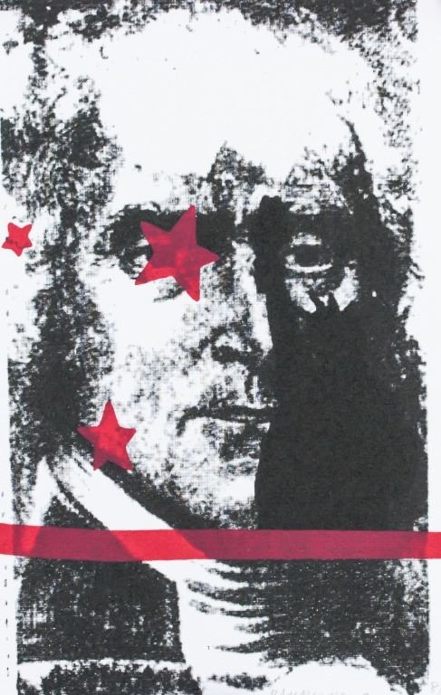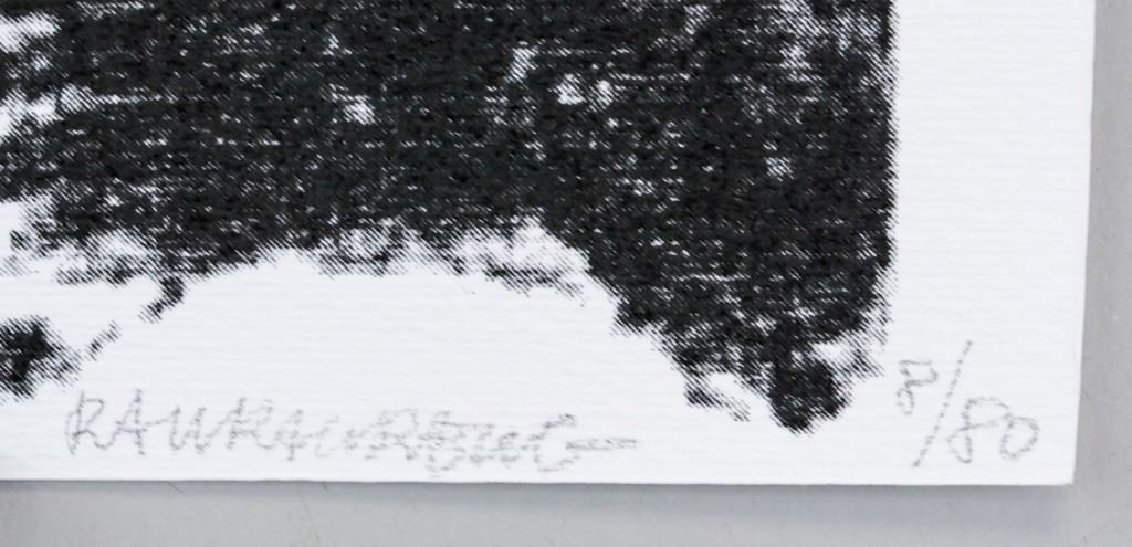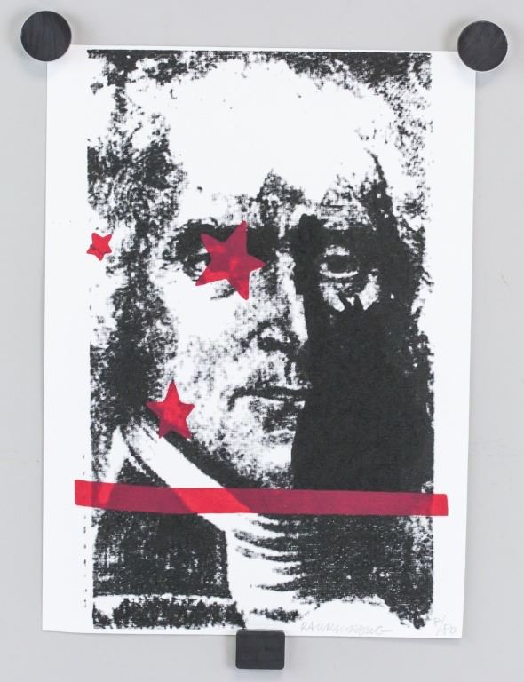 Lithograph on paper. Featuring black and white portrait with three red stars and a thick red line. Signed "Rauschenberg" to the bottom right. "8-/0" inscribed to the bottom right. "No. 12" inscribed on verso. "Harper Publishing" stamped on verso. 29 x 21 cm (11.5 x 8.5 inches).
