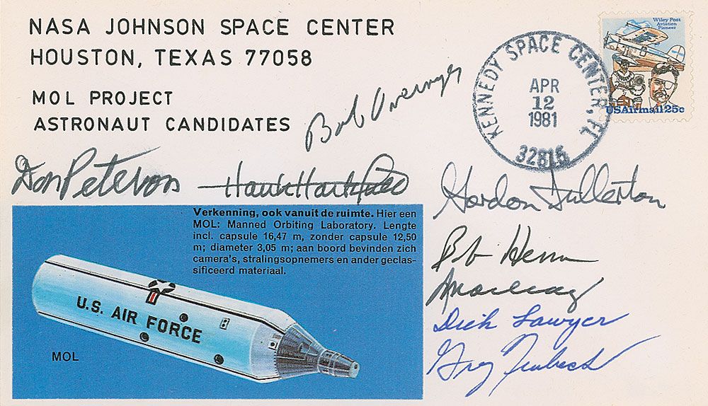 Commemorative cover with a cachet honoring the MOL mission, signed in blue and black ink by eight astronauts: Don Peterson, Bob Overmyer, Hank Hartsfield, Gordon Fullerton, Dick Lawyer, Lachlan Macleay, Francis Neubeck, and Bob Herres. In fine condition.