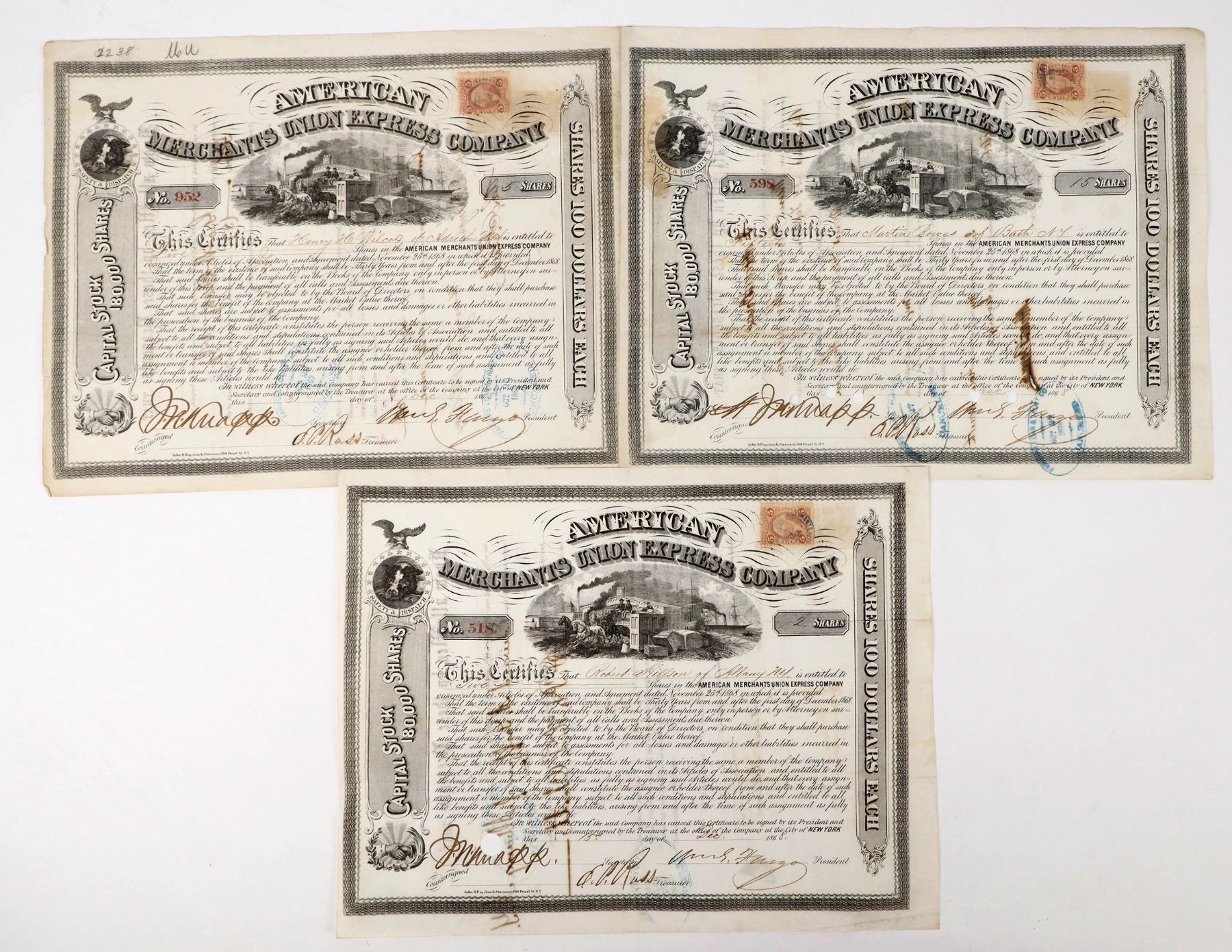 Lot of three stocks issued in 1868. Signed by William Fargo as president, Knapp as secretary, and Ross as treasurer. Stamp cancelled. This was the merger of American Express Company and Merchants Union Express Company. Please see photos for more details. For more history on the company and the different stock types issued, please see Fred Holabird's essay at: https://www.holabirdamericana.com/s/American-Express-and-Wells-Fargo-ajhp.pdf