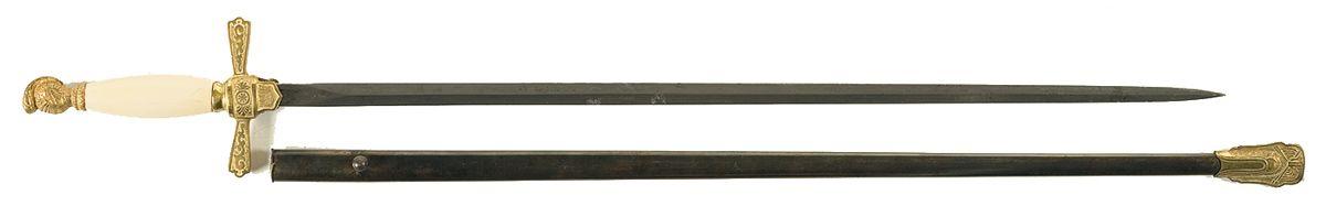 No makers marks on the 28" double edged blade, brass guard with scroll designs, smooth simulated ivory grip, helmet pommel and steel sheath with brass tip. Very good, with minor spotting, handling marks on the grip, and a mixed brown patina on the sheath.