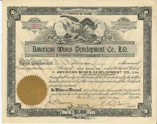 1904, Arizona. Stock certificate for 500 shares. Black with gold seal. Ornate border and vignette of eagle with spread wings and American flags at top center. Uncancelled. Very fine.
