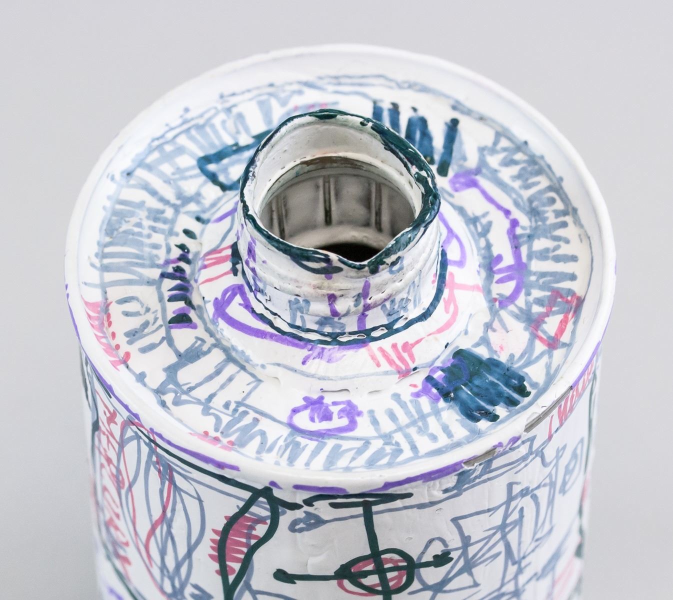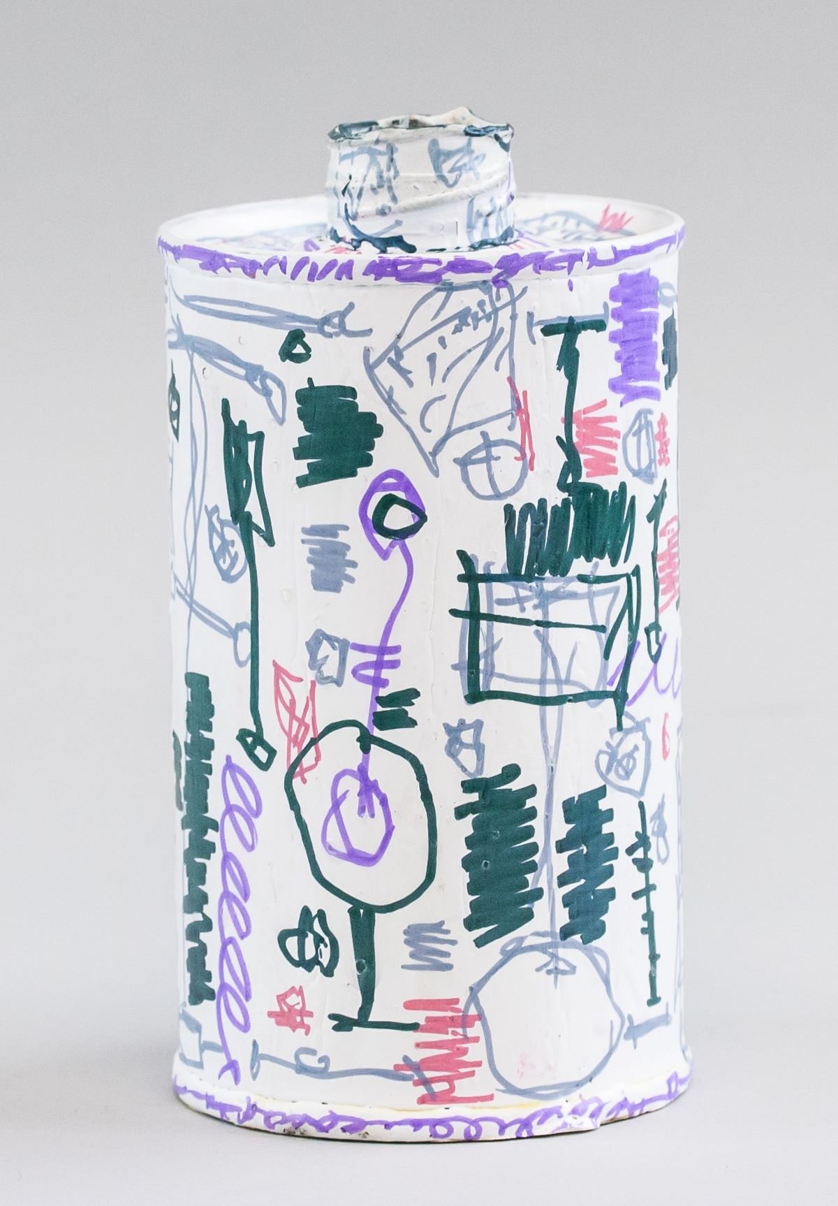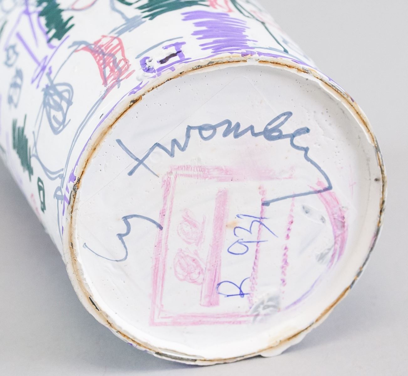 Mixed media sculpture. Of a can with colorful scribbles. Signed "Cy twombly" on base, accompanied with illegible stamp. 11 x 6.6 cm, 58 grams. Provenance: This lot carries limited provenance from a Southern Ontario estate