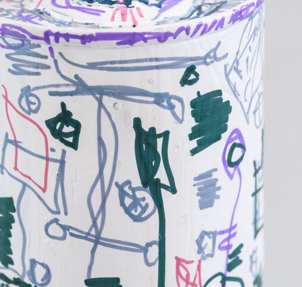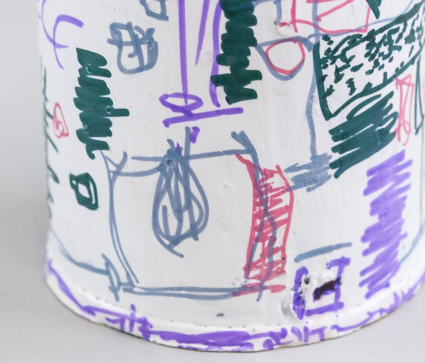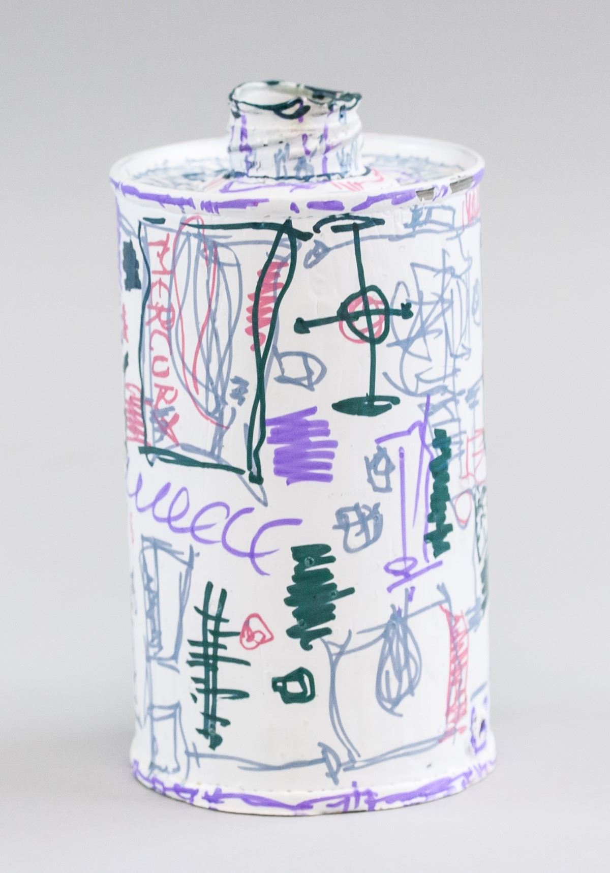 Mixed media sculpture. Of a can with colorful scribbles. Signed "Cy twombly" on base, accompanied with illegible stamp. 11 x 6.6 cm, 58 grams. Provenance: This lot carries limited provenance from a Southern Ontario estate