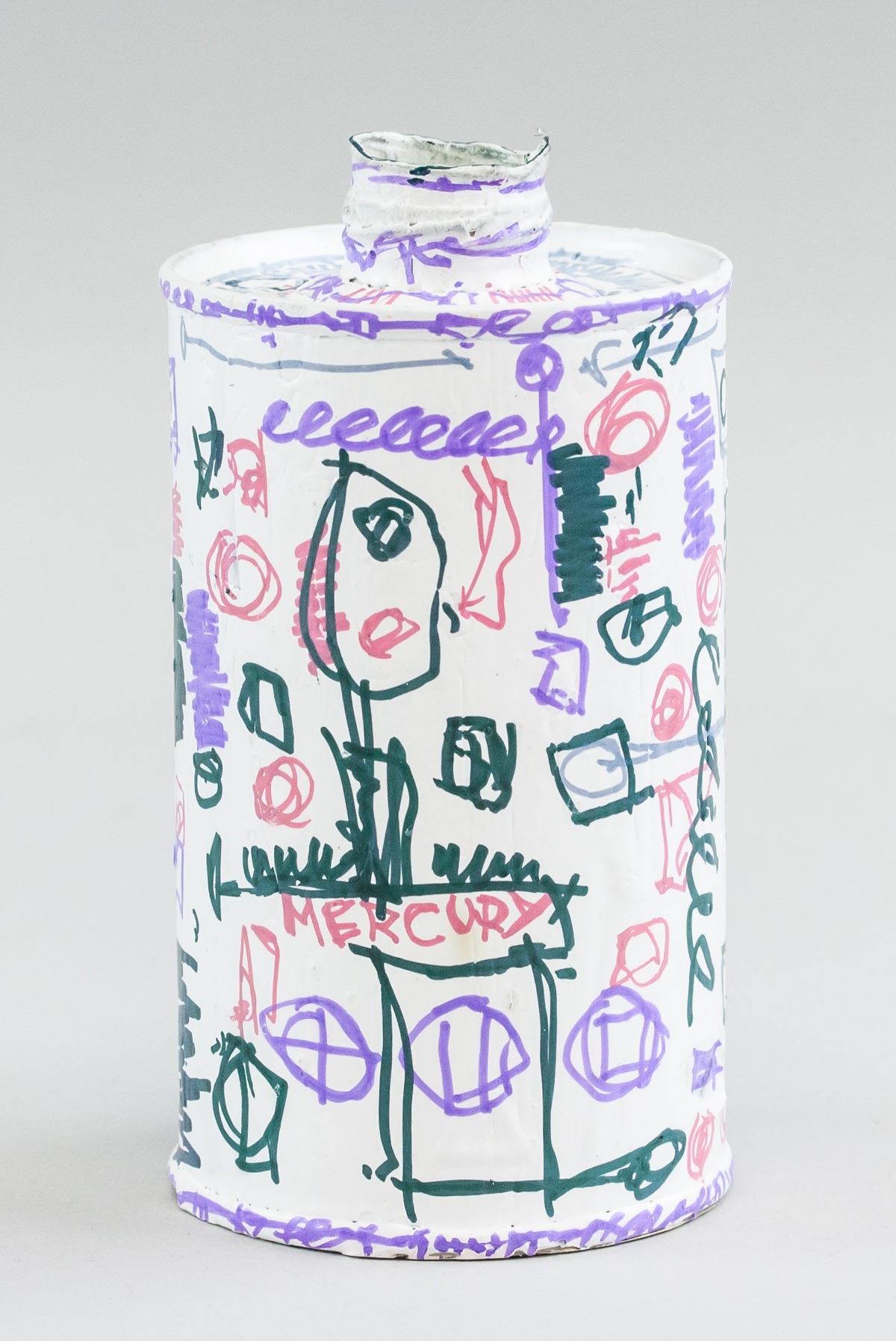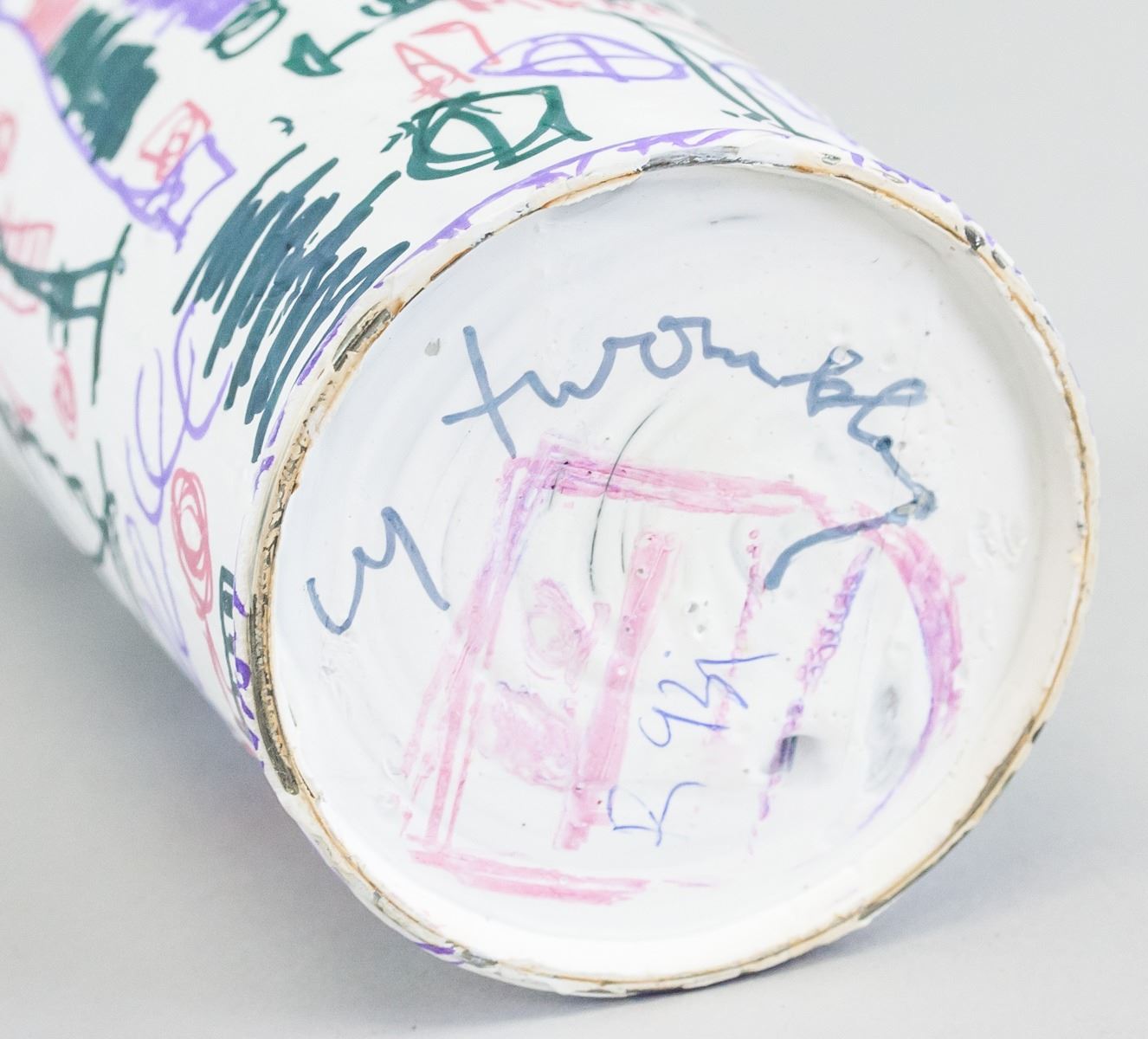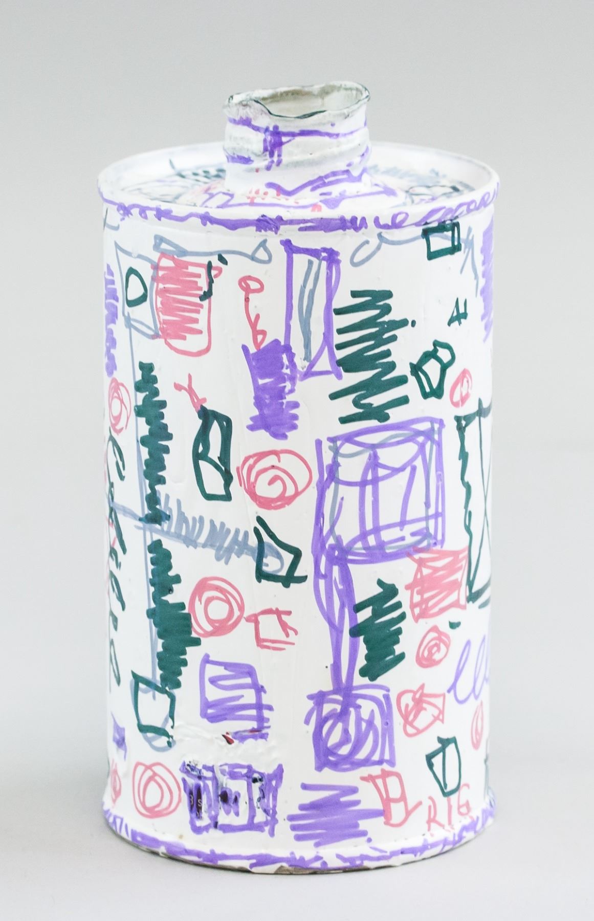 Mixed media sculpture. Of a can with colorful scribbles. Signed "Cy twombly" on base, accompanied with illegible stamp. 12 x 6 x 6 cm, 61 grams