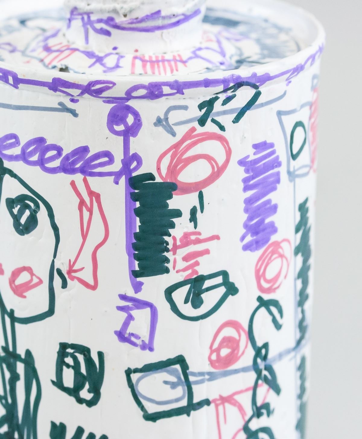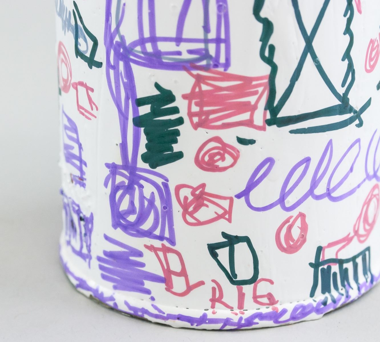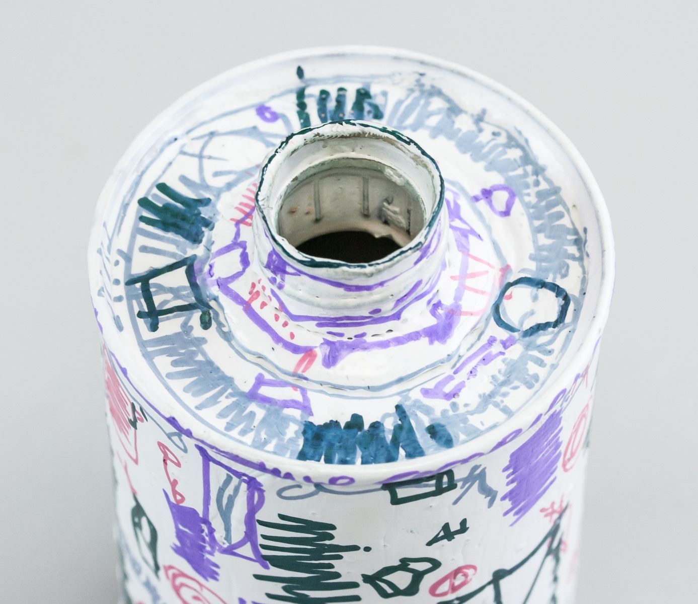 Mixed media sculpture. Of a can with colorful scribbles. Signed "Cy twombly" on base, accompanied with illegible stamp. 12 x 6 x 6 cm, 61 grams