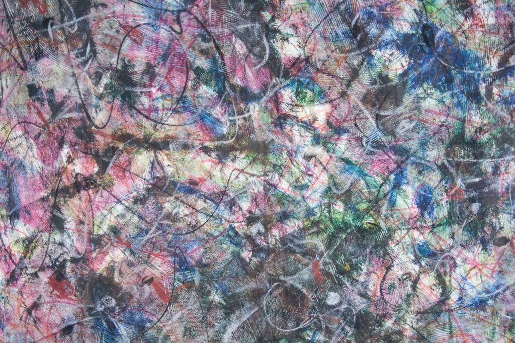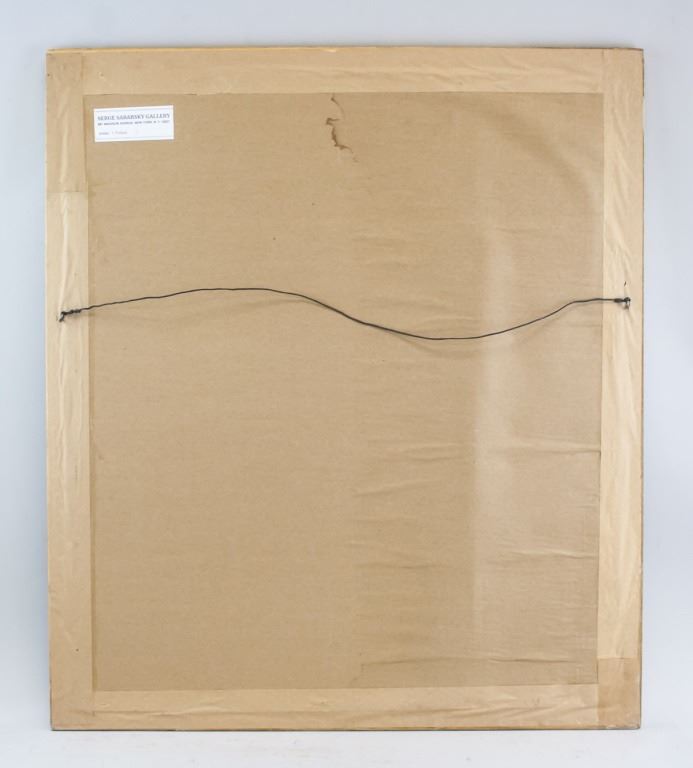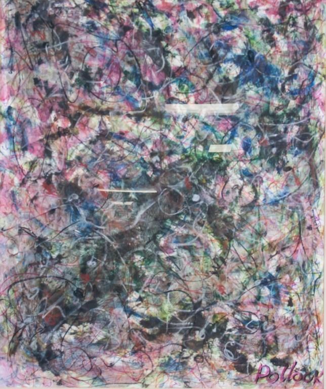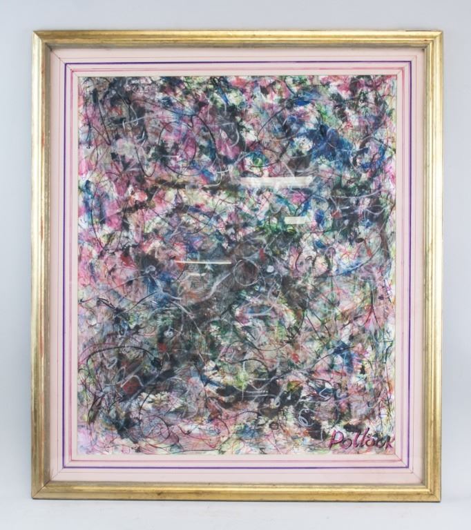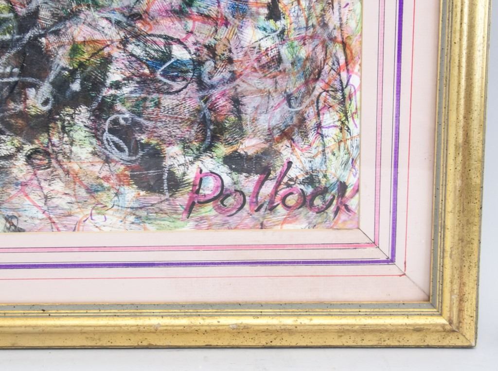 Mixed media on canvas, framed. Featuring abstract composition. Signed "Pollock" to the bottom right corner. Label on verso reads "SERGE SABARSKY GALLERY / Artist: J. Pollack". 74 x 55 cm (29 x 21.5 in), Frame: 81 x 70 cm (32 x 27.5 in).