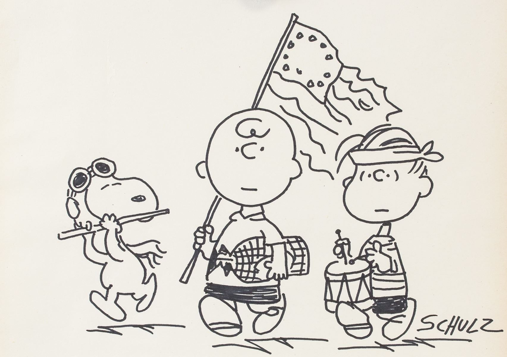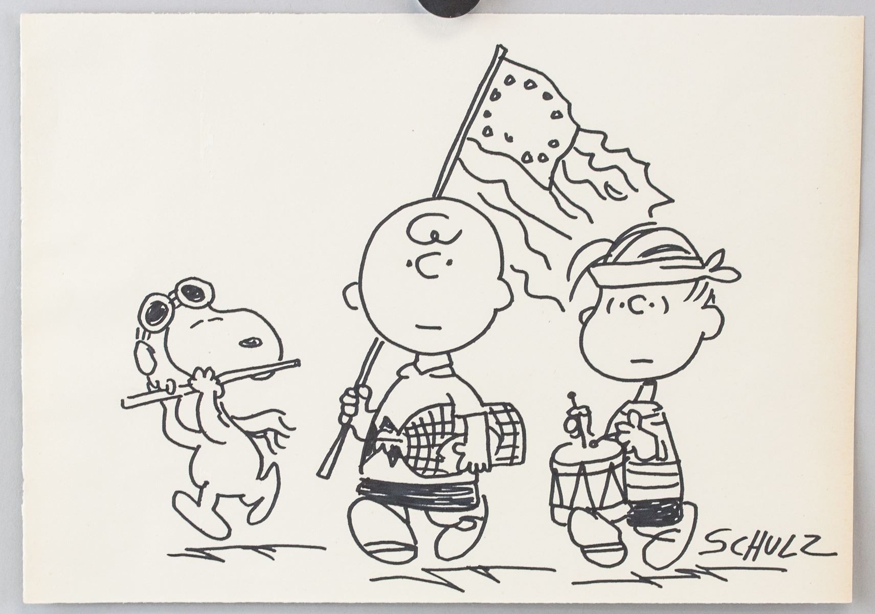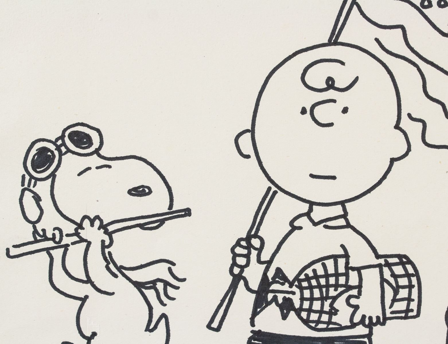 Mixed media on paper. Featuring Snoopy, Charlie Brown, and another child. Signed "Schulz" in the bottom right corner. 20.5 x 29 cm (8 x 11.5 inch). Provenance: This lot carries limited provenance from an Upper New York estate