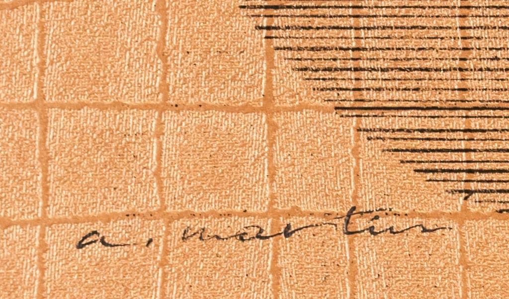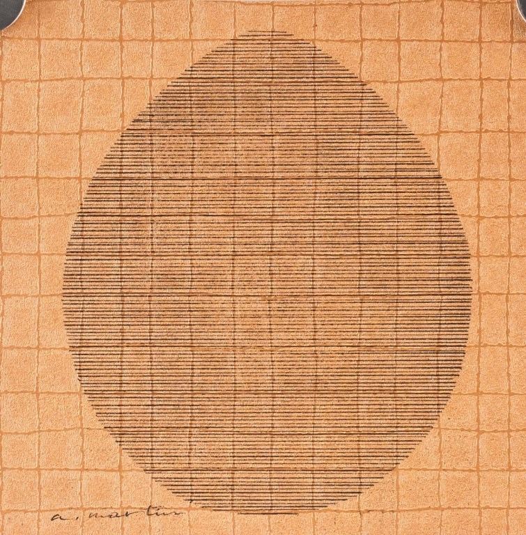 Ink on paper. Featuring tear drop shape on orange grid paper. Signed "A. martin" in the bottom left corner. "PRI" stamped on verso. 16.3 x 16.5 cm (6.5 x 6.5 inches). Provenance: This lot carries limited provenance from a Southern Ontario estate