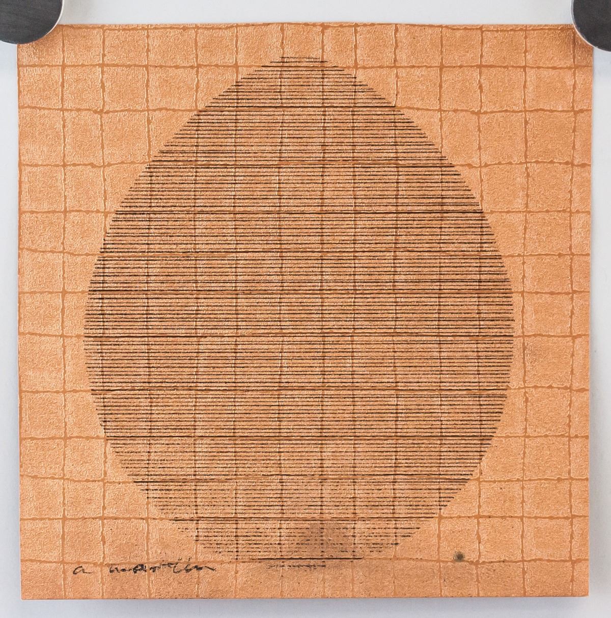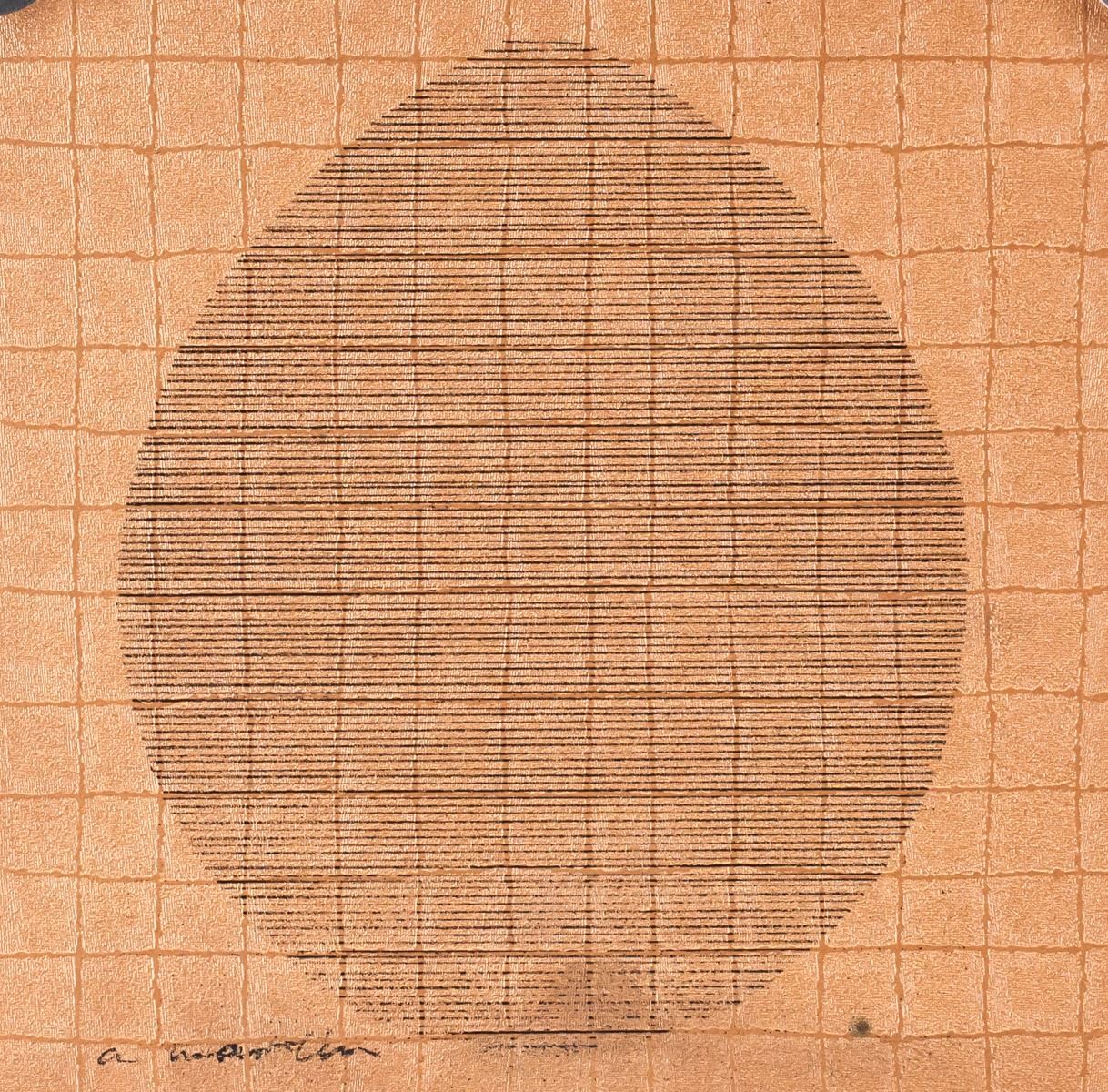 Ink on paper. Featuring tear drop shape on orange grid paper. Signed "a. martin" in the bottom left corner. "RCH" stamped on verso. 16.5 x 16.5 cm (6.5 x 6.5 inches)