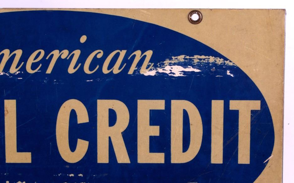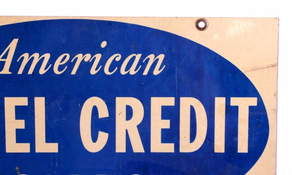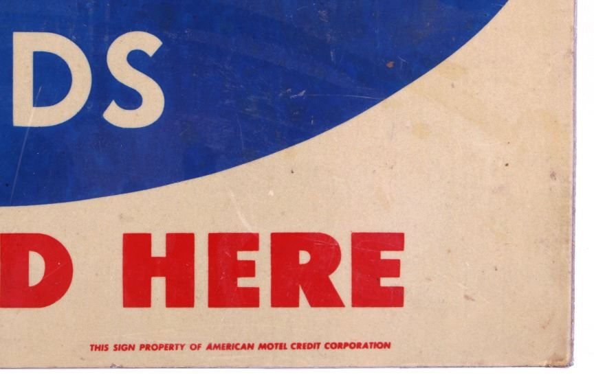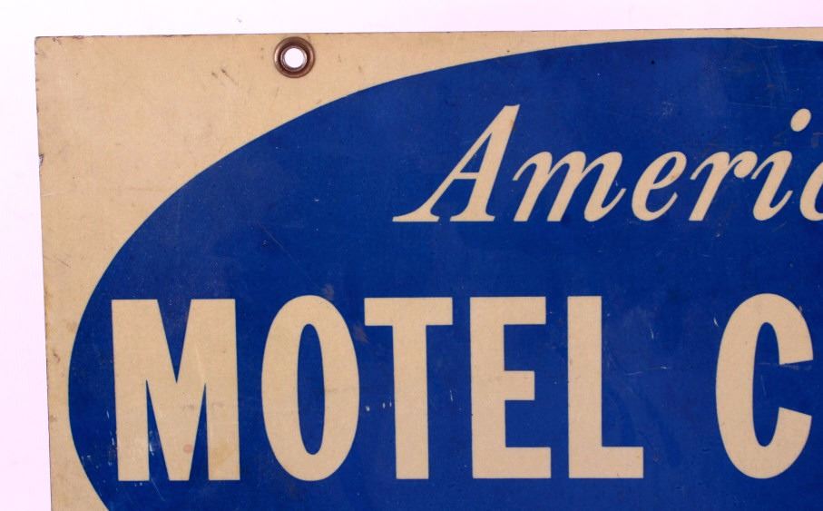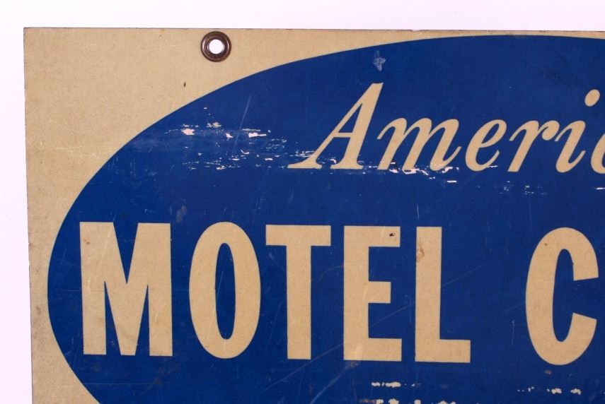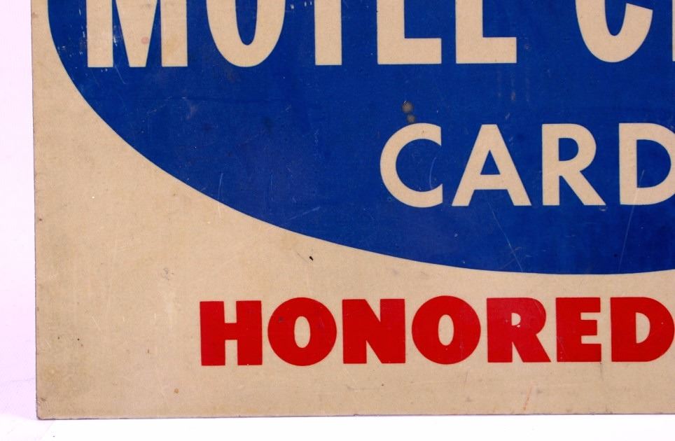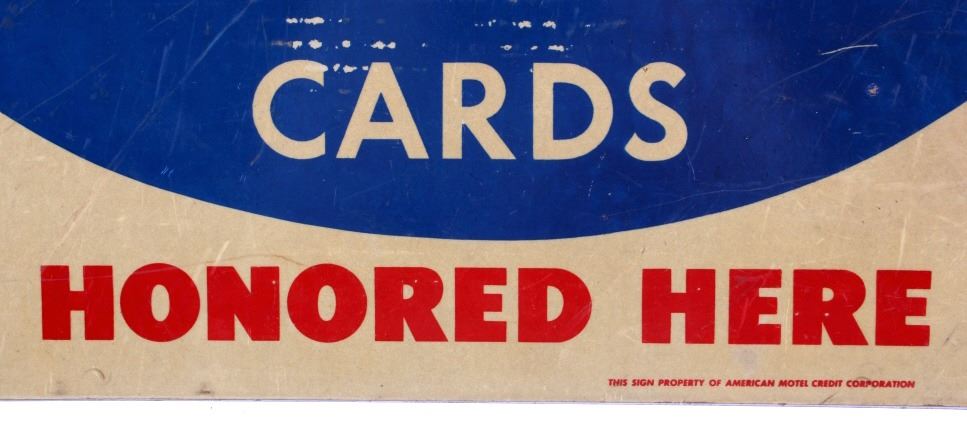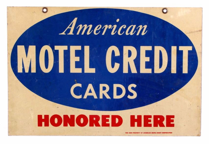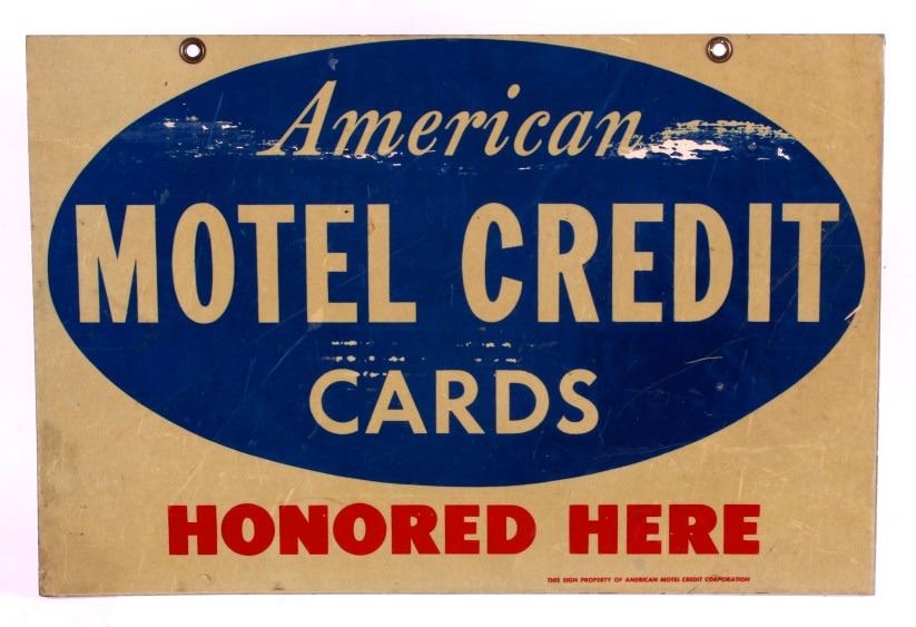 This is an American Motel Credit Cards sign. The sign is double sided and reads "American Motel Credit Cards Honored Here". The sign is aluminum and has two mounting holes reinforced with brass grommets. The American Motel Credit Cards sign is in good overall condition with moderate wear. The sign measures 12" x 18".