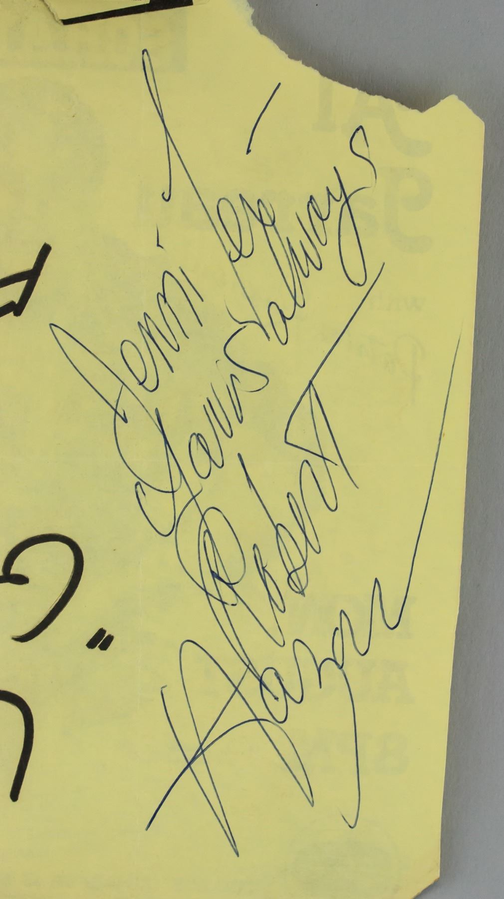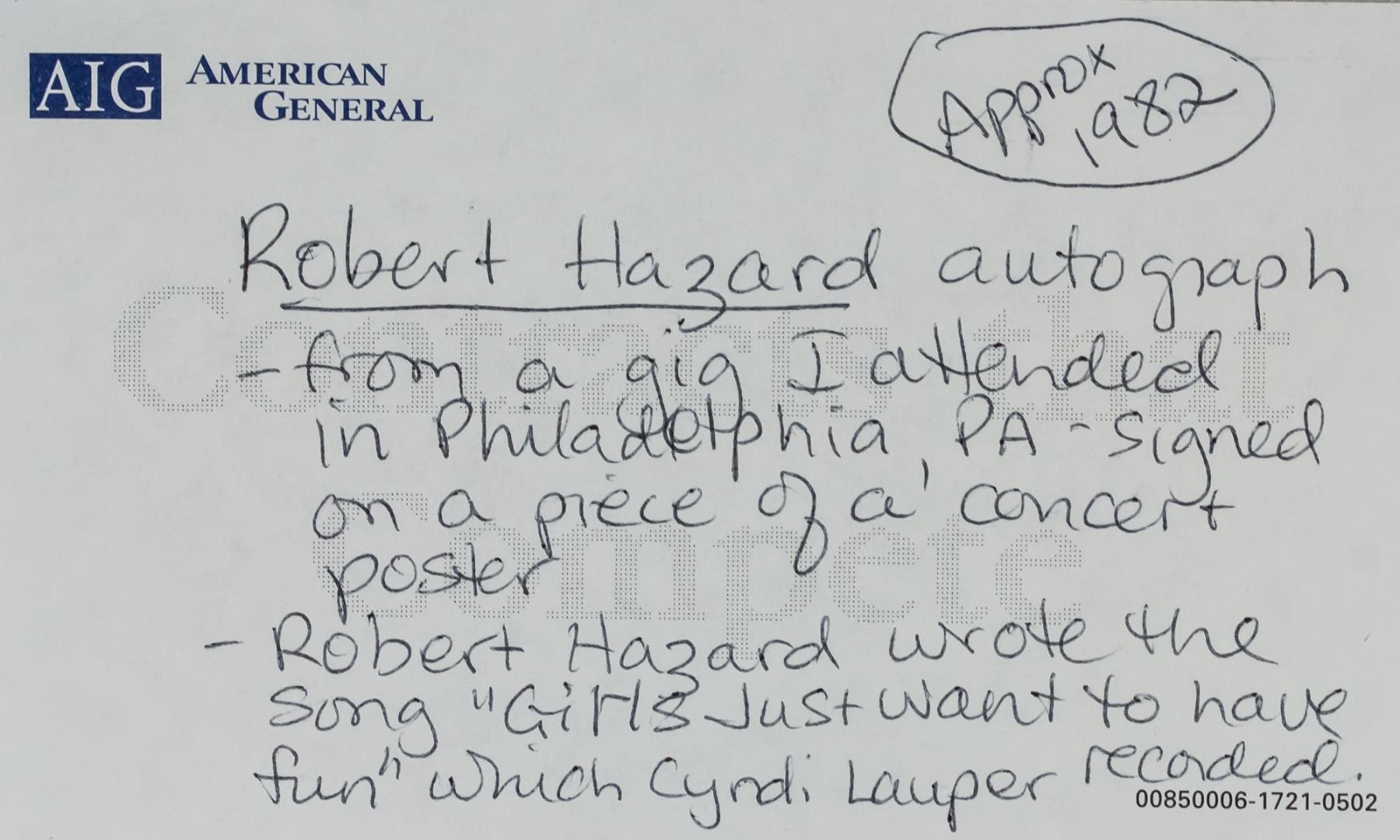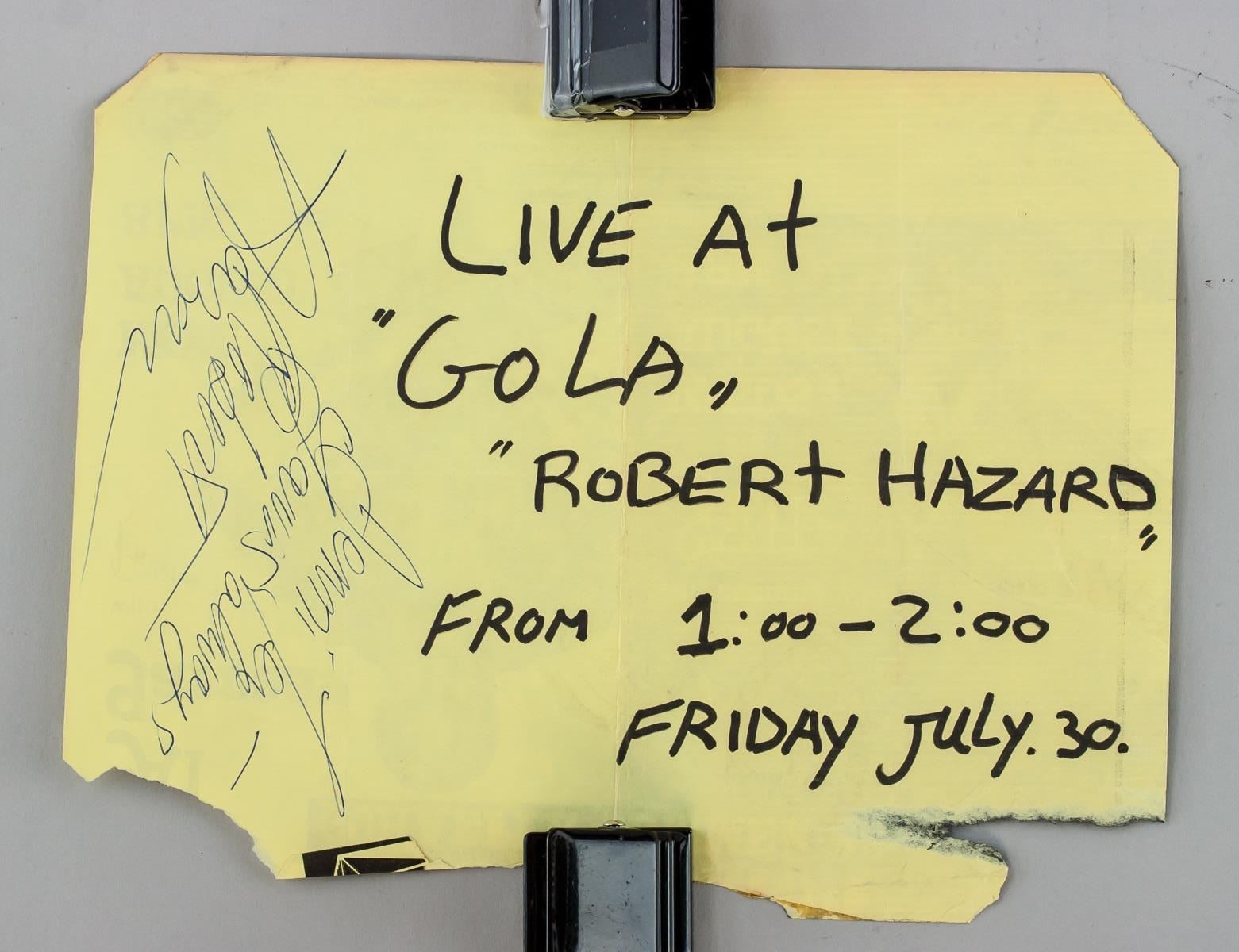 Robert Hazard autograph with dedication addressed to ‘Jenni’ written on the back of newspaper clipping for the Electric Factory (Philadelphia, PA), dated 1982. Inscribed “Live at Go LA” “ROBERT HAZARD” / From 1:00-2:00 / FRIDAY JULY.30. The Robert hazard autograph was from a gig attended by the current owner in Philadelphia, PA – signed on a piece of a concert poster, circa 1982. 21 x 28 cm (8.3 x 11.0 inches). PROVENANCE: Private American collection.