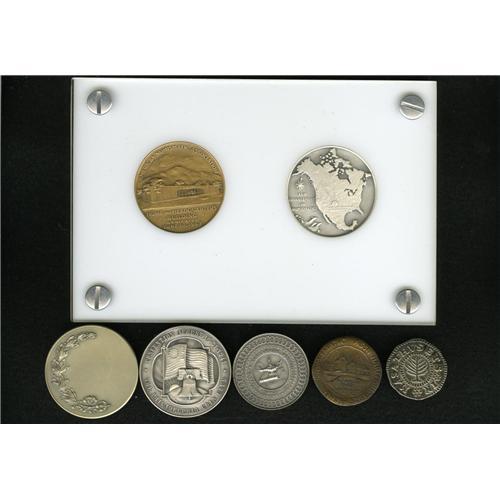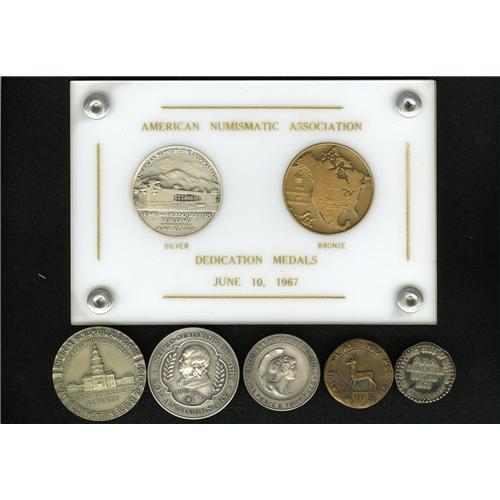 <B>American Numismatic Association Convention Medallion Group Lot.</B></I> Consists of seven medallions issued by the ANA or an affiliated coin club: one struck in silver for the 50th anniversary convention, 1941, in Philadelphia; one in silver for the 66th annual convention, also in Philadelphia; a 1927 bronze piece from the show held in Hartford, Connecticut; a silver and bronze 1967 dedication set for the new headquarters; a 25th anniversary silver membership medal; and a 1960 bronze Boston convention token. This is a super opportunity for a collector of ANA material to acquire some of the scarce silver convention medals from more than 50 years ago. Current market value is approximately $200.<BR><BR><b>Shipping:</b> Coins & Currency (<a target="_blank" href="http://www.heritageauctions.com/common/shipping.php">view shipping information</a>)