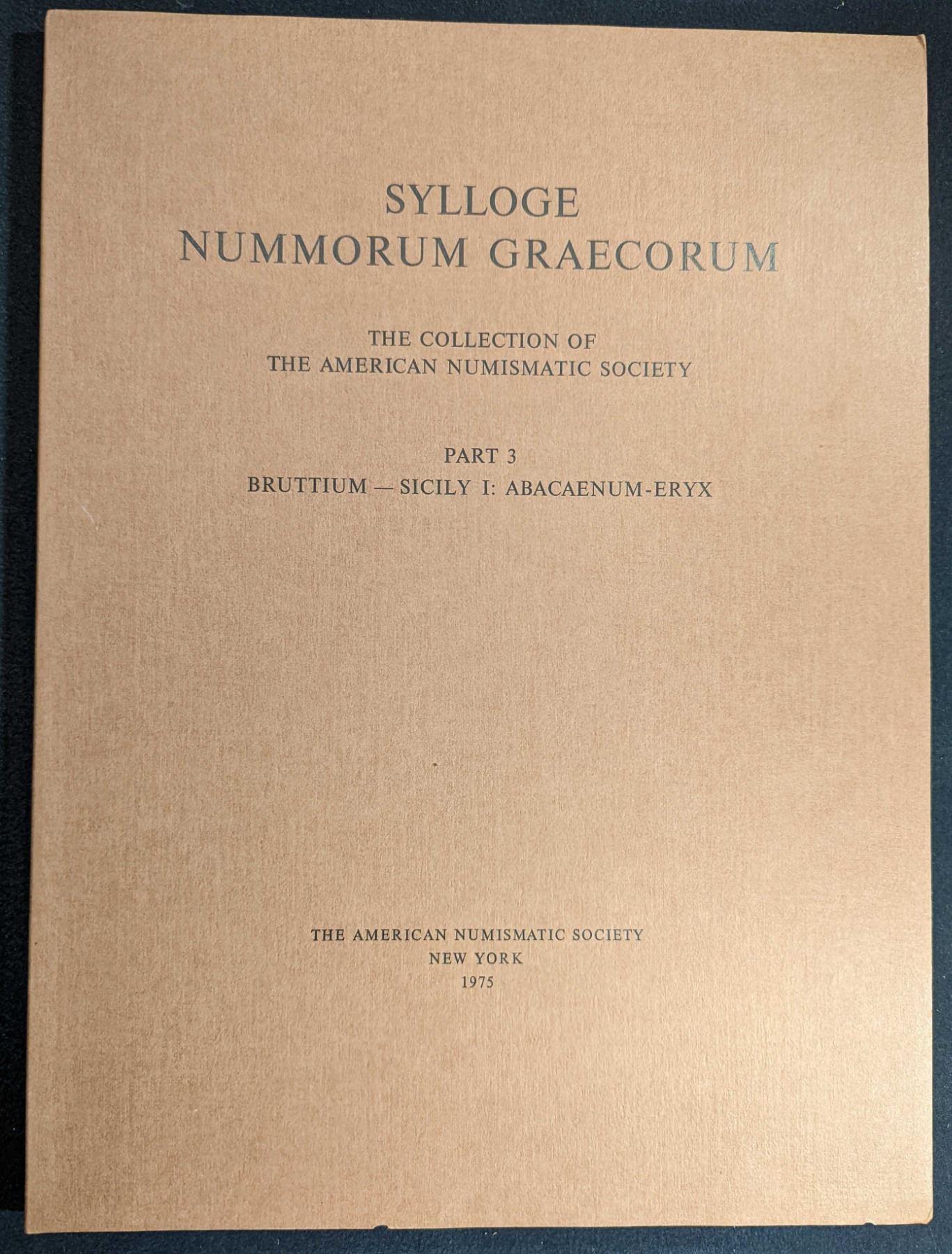 American Numismatic Society. SYLLOGE NUMMORUM GRAECORUM. THE COLLECTION OF THE AMERICAN NUMISMATIC SOCIETY. PART 3. BRUTTIUM - SICILY I - ABACAENUM - ERYX. The American Numismatic Society. 1975. fo. 77 pages. Original printed russet card covers. 38 fine plates, each with a page of facing descriptive text. Fine. Clain-Stefanelli 1917*. Daehn 1962. Kroh 13 (four stars): "This collection is one of the best in the world and both the scope and scholarship of these volumes are excellent." Lot weight: 1 lbs 13oz. Subject(s): Ancient Coinage.