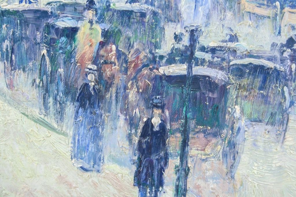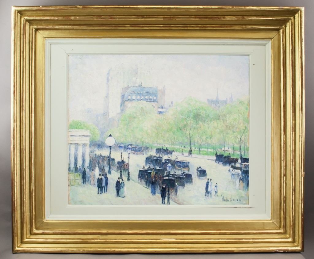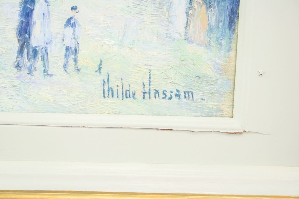 Oil on canvas, framed. Featuring street scene with carriages and well-dressed figures. Signed "Childe Hassam" to the bottom right corner. Canvas size: 52 x 62.5 cm (20.5 x 24.75 inches). Frame size: 82 x 98 cm (32.25 x 37.5 inches).