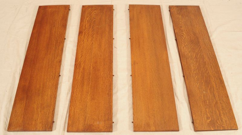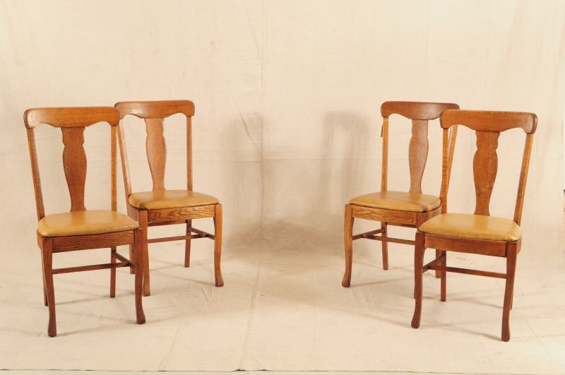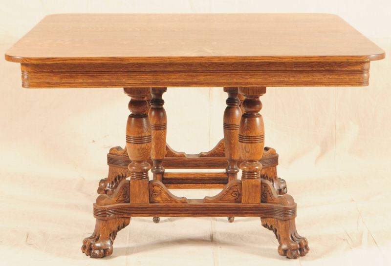 Quarter Sawed Oak. Ornate carved base with Lion head motif. Turned legs, incised lines. Center Support Leg. Original casters. With 4 original 12" W Leaves and Set of 15 American Oak T-Back Chairs with distressed leather seats. Measures 48" x 47-1/2" (no leaves); Approx 7 ft 11" with all 4 leaves.