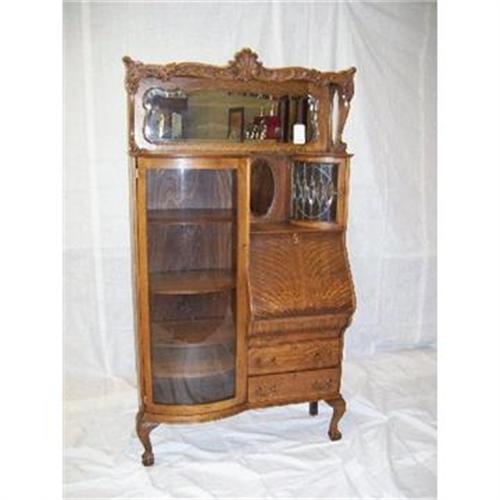 One of a kind American Oak Secetary. With a serpetine drop front desk, and small leaded glass corner cabinet. Adorned with beautiful carvings and wooden ball and claw feet. Price includes compelte restoration and refinishing by our highly skilled in house craftsman.
