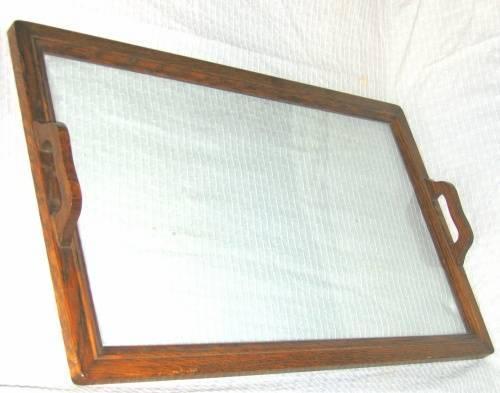 The well-to-do often served breakfast on an oak frame & handled glass top tray like this. A recessed area beneath the top glass allows for a second piece of glass to be set in where mementos (locks of hair, cards, pictures) may be placed. Aprox 20"x24".