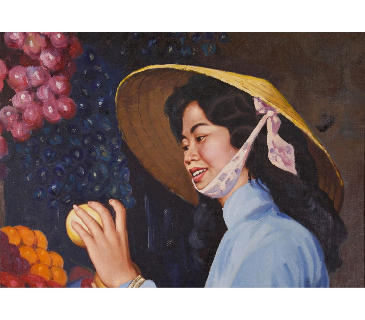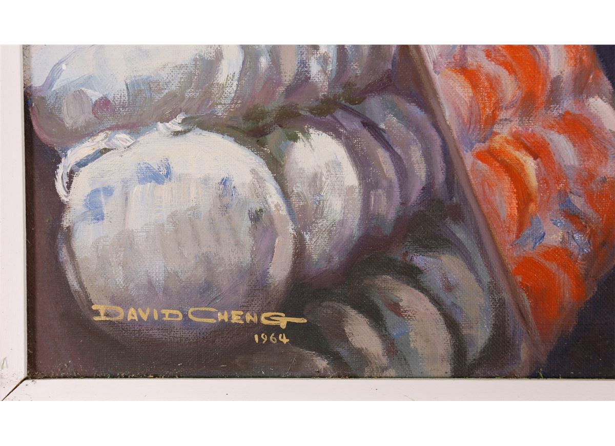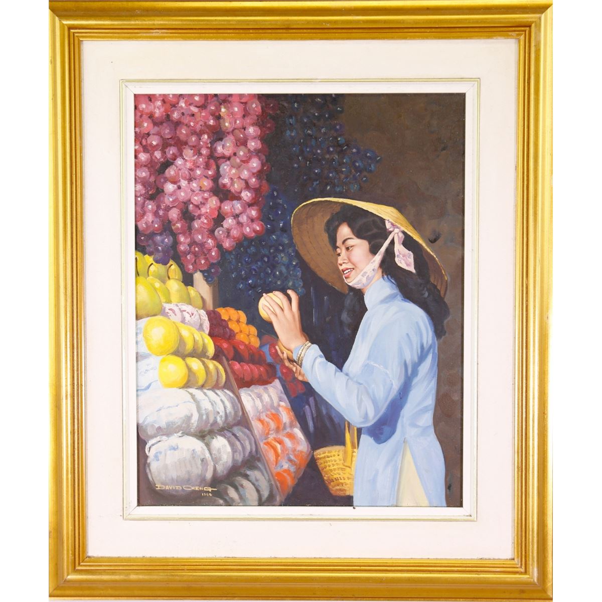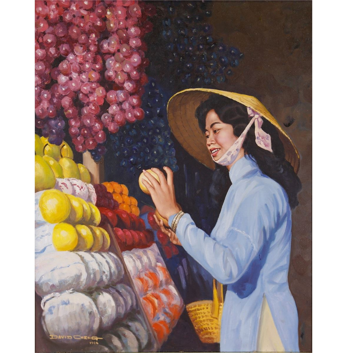 Chinese lady picking fruits; American oil on canvas; framed; signed by David Cheng and dated 1964; 73 cm x 61 cm, 50 cm x 39 cm without frame