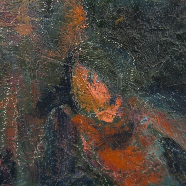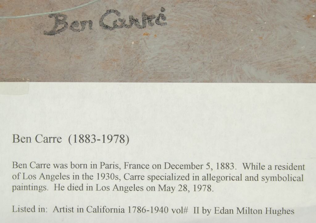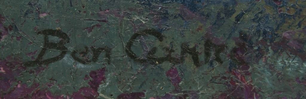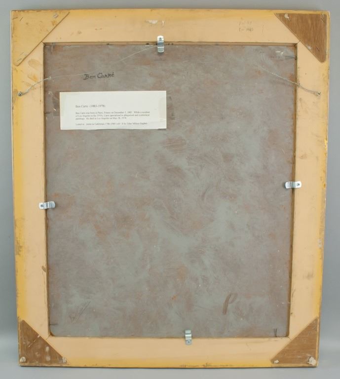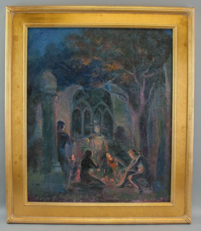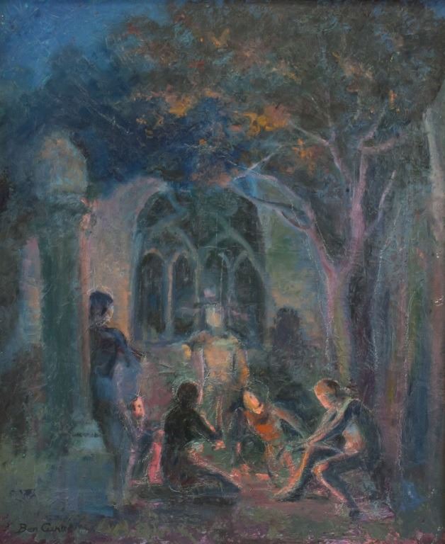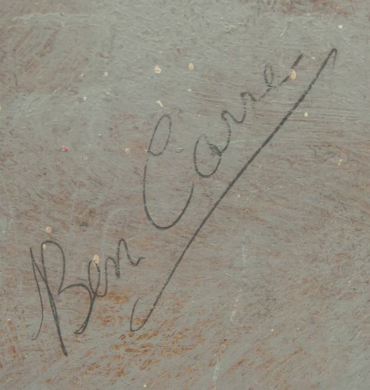 Oil on board, framed. Featuring a group of people sitting around a fire. Signed "Ben Carre" to the bottom left corner. Label verso gives biographical information on the artist. "Ben Carre" inscribed on verso. Piece titled "Campfire". 61 x 51 cm (24 x 20 inches).