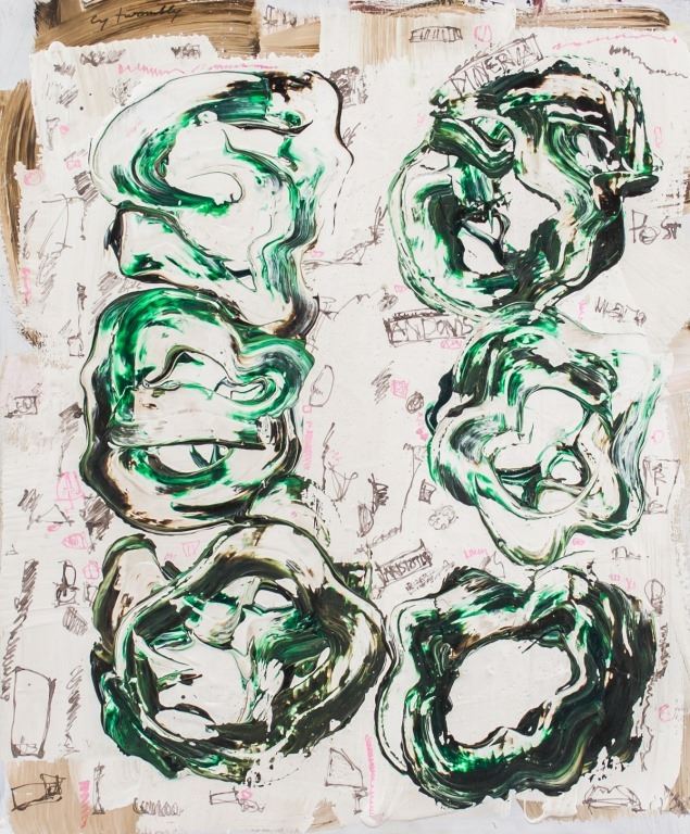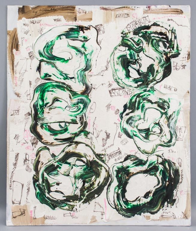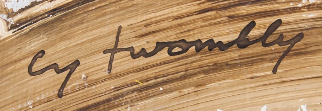 Oil on board. Featuring swirled cirles on off-white background. Signed "Cy Twombly" to the top left corner. "KT" stamped on verso. 61 x 38 cm (24.5 x 15 inches). Mat size: 99 x 69 cm (39 x 27.5 inches).
