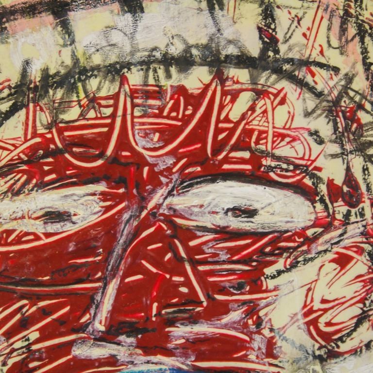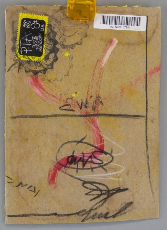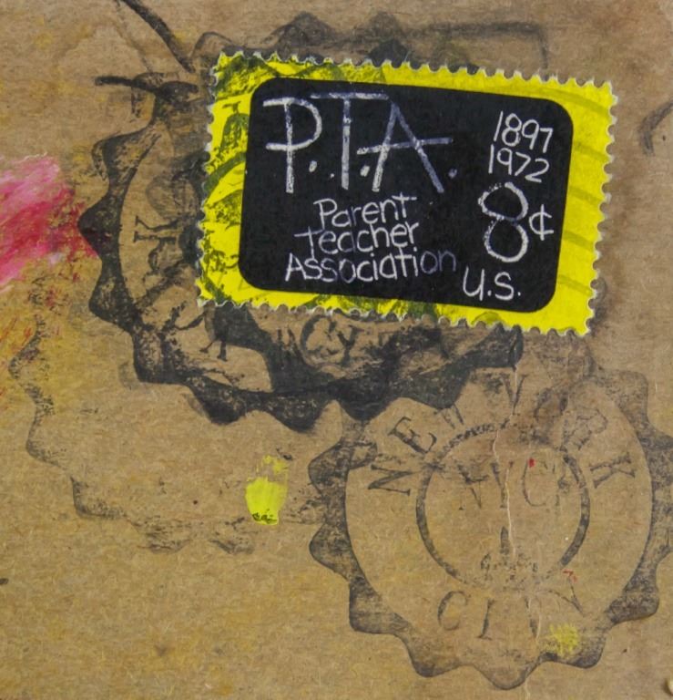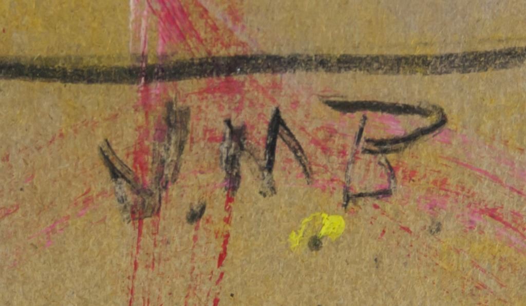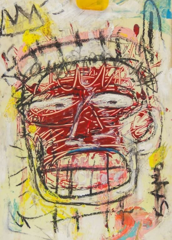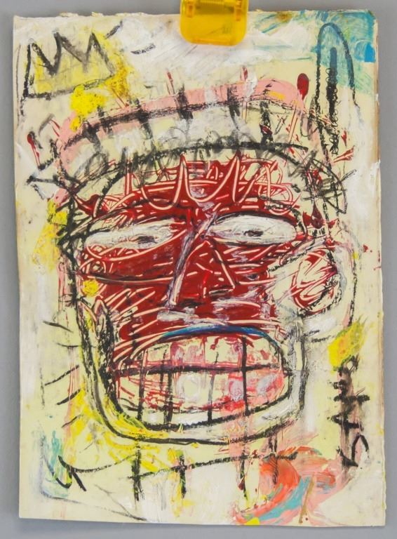 Oil on board. Featuring a neo-expressionist portrait. Signed SAMO alongside lower right corner. Also signed JMB on verso. with outline of a postal card and faux stamp. 19 x 14 cm (7.5 x 5.5 inches)