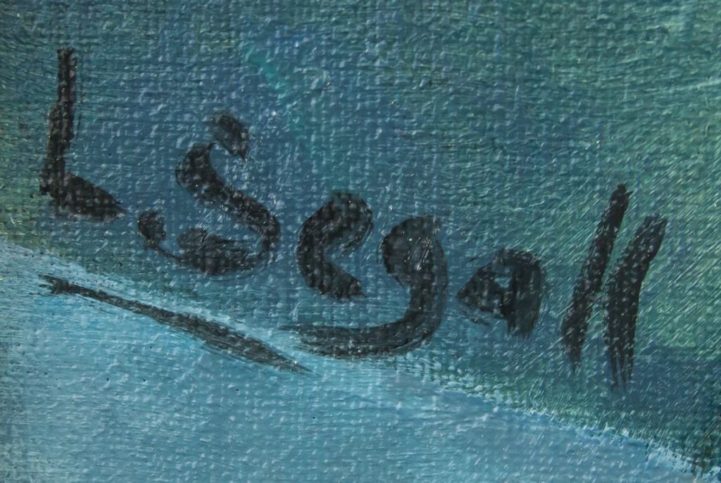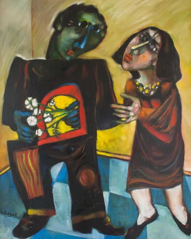 Oil on board, framed. Featuring a couple, with the man holding a bunch of white flowers. Signed "L. Segall" to the bottom left corner. Panel size: 99 x 78 cm (39 x 30.5 inches). Frame size: 117 x 98 cm (46 x 38.5 inches).
