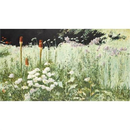 <B>Jerry Newman </B></I>(American, 20th century)<BR><B><BR></B></I><I>Garden Encounter - Chester</B></I> <B><BR></B></I>20th century<BR>Oil on canvas<BR>Signed lower right<BR>50 x 90 inches (127 x 228.6 cm)<BR><BR> Jerry Newman, a native Texan who earned his Master of Fine Arts Degree at the University of Southern California after graduating from the University of Texas and receiving a Teaching Excellence Award from the University of Lamar. Working primarily with watercolors and oil, his oil paintings invariably invite the viewer deep inside the work. In the instance of <I>Garden Encounter - Chester, </B></I>one is drawn into the garden space the artist has happened upon and so vividly captured.<BR><BR>Newman makes great use of shading in the garden setting where green predominates, taking the palette in the foreground from light to the dark background, creating a sense of depth sprinkled with the sparkling colors of the flowers throughout.<BR><BR>Featured in <I>Southwest Art Magazine, </B></I>Newman’s works have received first-place honors at the Beaumont Art Museum and the Liberty Texas Annual Exhibition as well as at the Cloudcroft, New Mexico exhibition. Collections of his work have been installed at the Citizen National Bank at Dallas and the Pennzoil Oil Company at Houston. <BR><BR>Provenance:<BR>Adelle M. Gallery, Dallas (1986) <B>Condition Report:</B> Normal signs of wear as appropriate with age.<BR><BR><b>Shipping:</b> Requires 3rd Party Shipping (<a target="_blank" href="http://www.heritageauctions.com/common/shipping.php">view shipping information</a>)