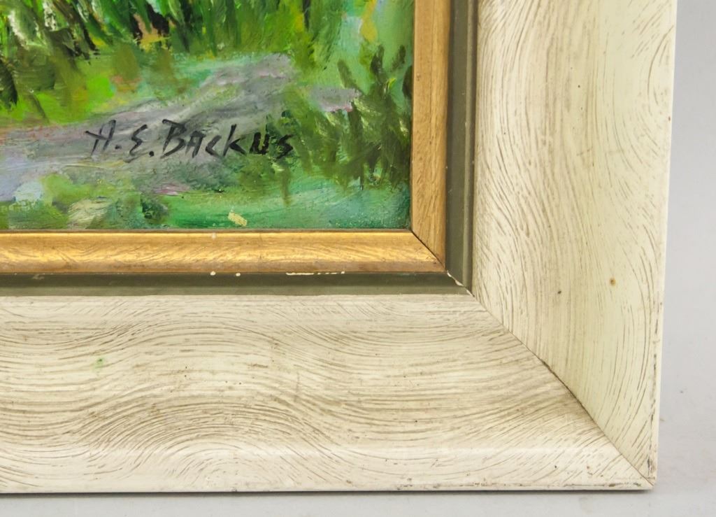 Oil on canvas, framed. Featuring palm trees by the water. Signed "A. E. Backus" to the bottom right corner. Canvas size: 35 x 26 cm (13.75 x 10.25 inches). Frame size: 43 x 35 cm (17.0 x 13.75 inches).