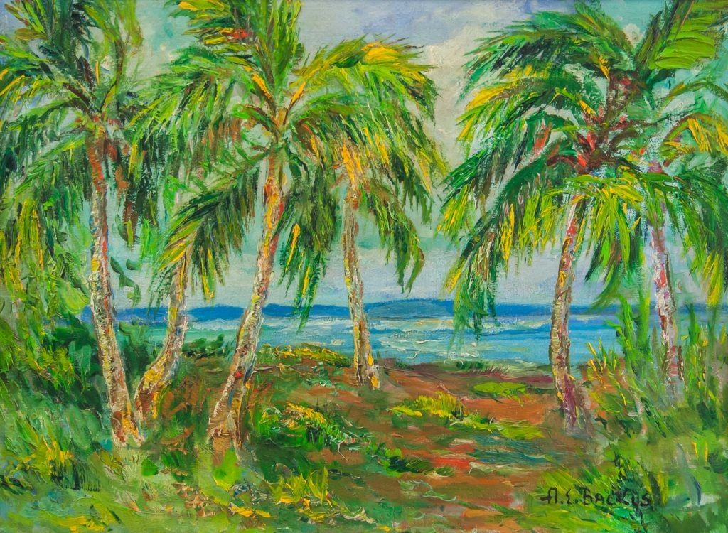 Oil on canvas. Featuring seaside scene of palm trees by the water. Signed "A. E. Backus" to the bottom right corner. Canvas size: 33 x 45 cm (13 x 17.7 inches). Frame size: 41.5 x 53 cm (16.2 x 21 inches).