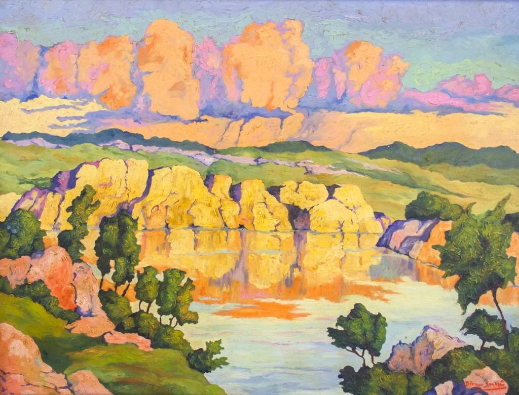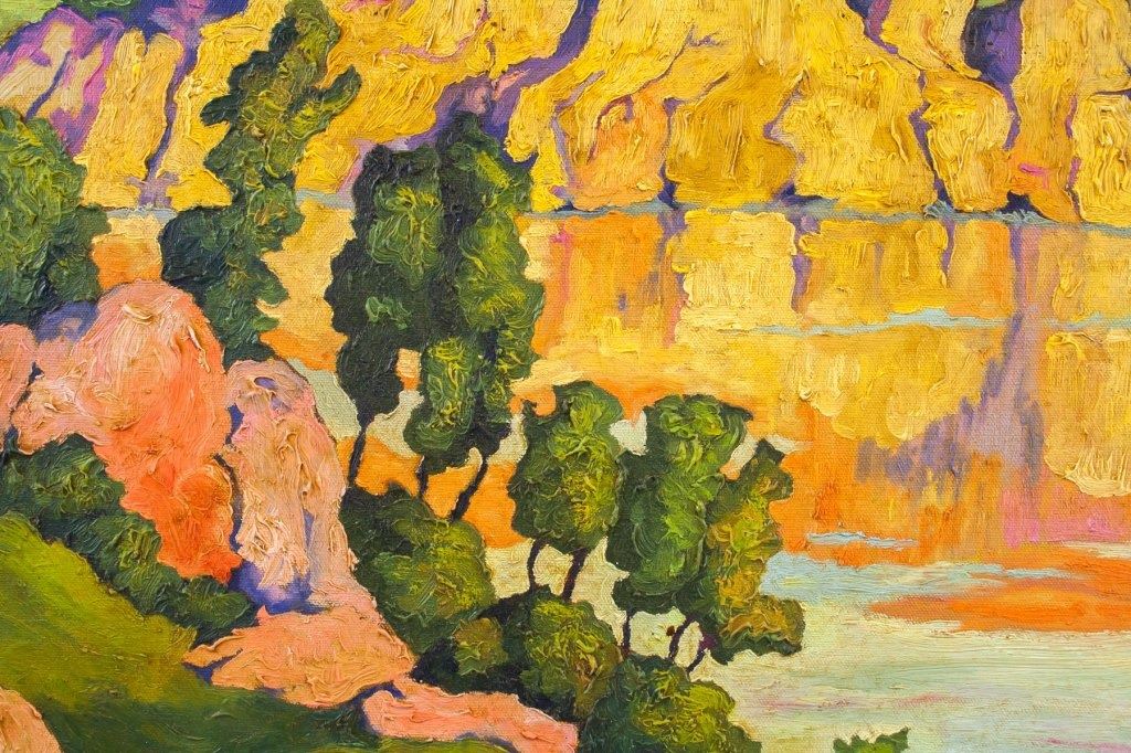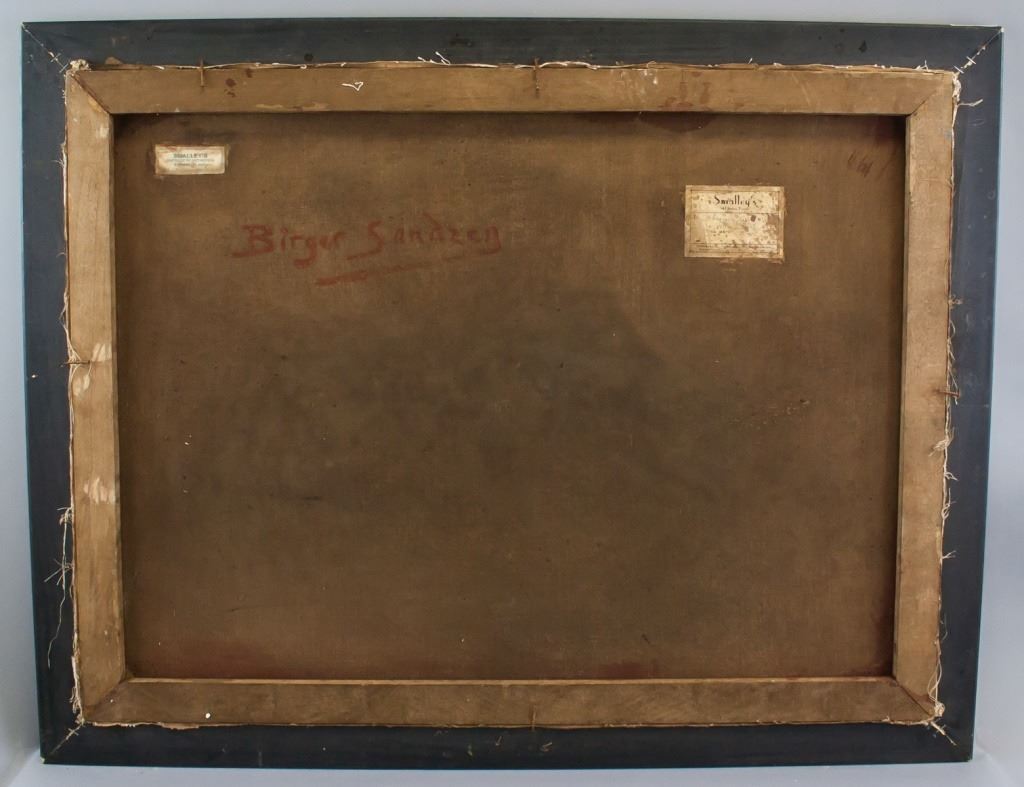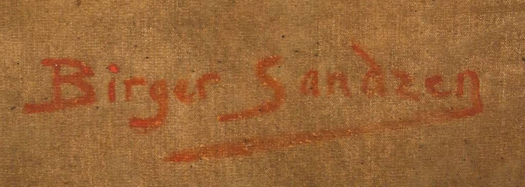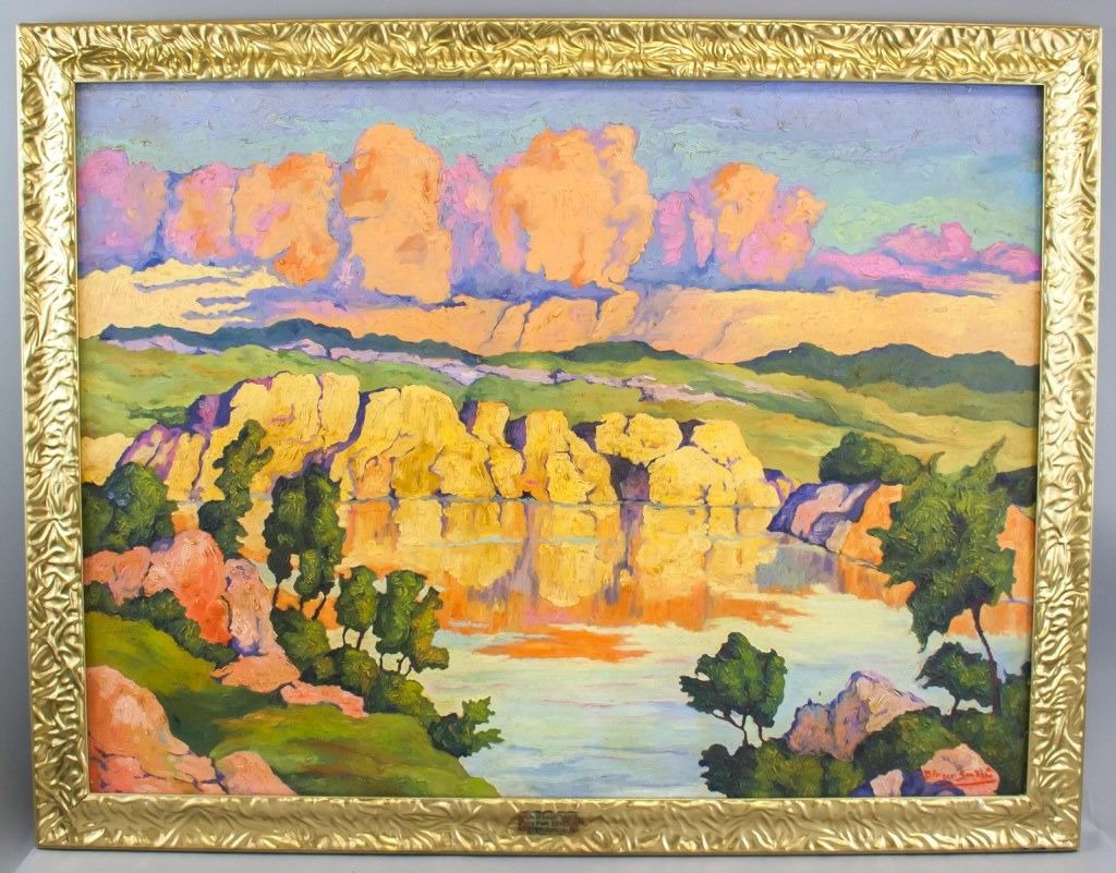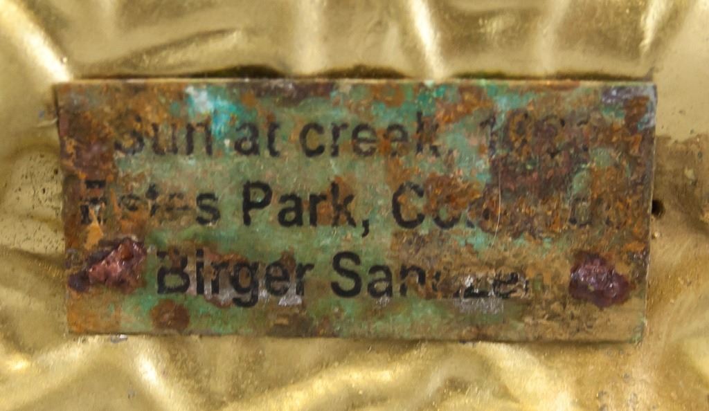 Oil on canvas, framed. Featuring sunset landscape scene. Signed "Birger Sandzen" to the bottom right corner. "Sun at Creek [...] Birger Sangzen" stamped on metal plate beneath image. "SMALLEY'S" label on verso. "Birger Sandzen" inscribed on verso. "Smalley's / To Stevensons lake, Utah to Father, 1944From Mark" label on verso. Canvas size: 58 x 78.5 cm (23 x 30.7 inches). Frame size: 69 x 89 cm (27 x 35 inches).