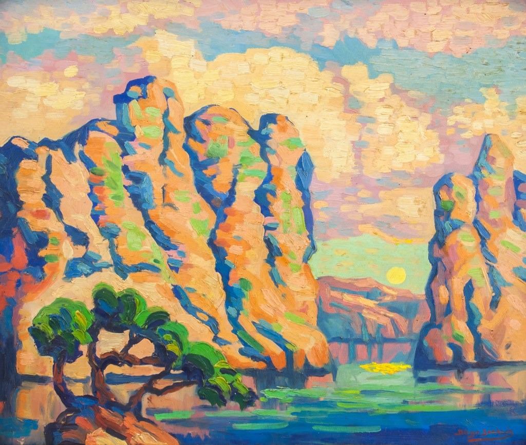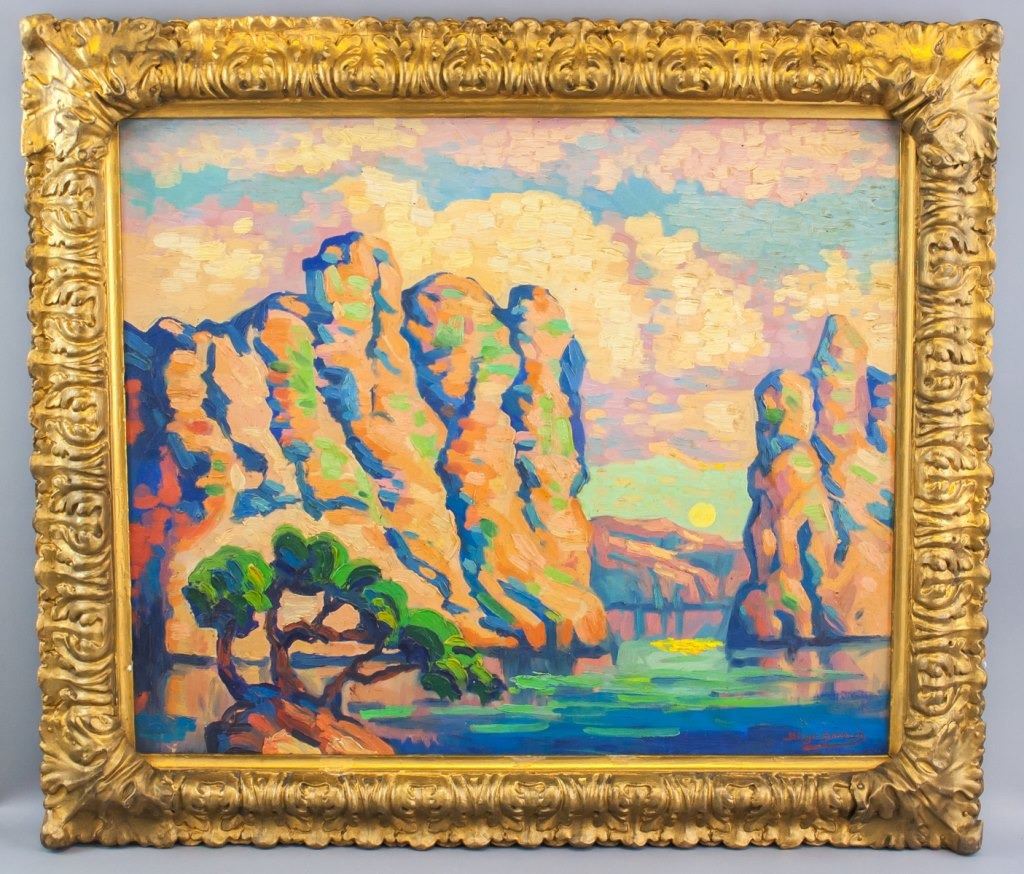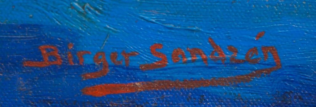 Oil on canvas, framed. Featuring a landscape scene. Signed Birger Sandzen on the lower right corner. Gallery label affixed to verso inscribed "THE PACE GAlLERY / 32 EAST 57TH STREET/NEW YORK, NEW YORK 10022". Inscribed in ink Birger Sandzen / #00159. Another gallery affixed to verso inscribed "Smalley's / McPherson, Kanzas / To: My mother-Maria of Amy". Stamped on stretcher bar with address, partially illegible, bottom inscribed "KANSAS CITY, MISSOURI". Canvas size: 49 x 59 cm (19.3 x 23.3 inches). Frame size: 64 x 74 cm (25 x 29 inches)