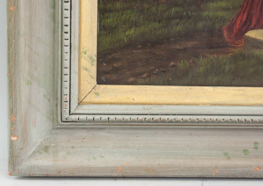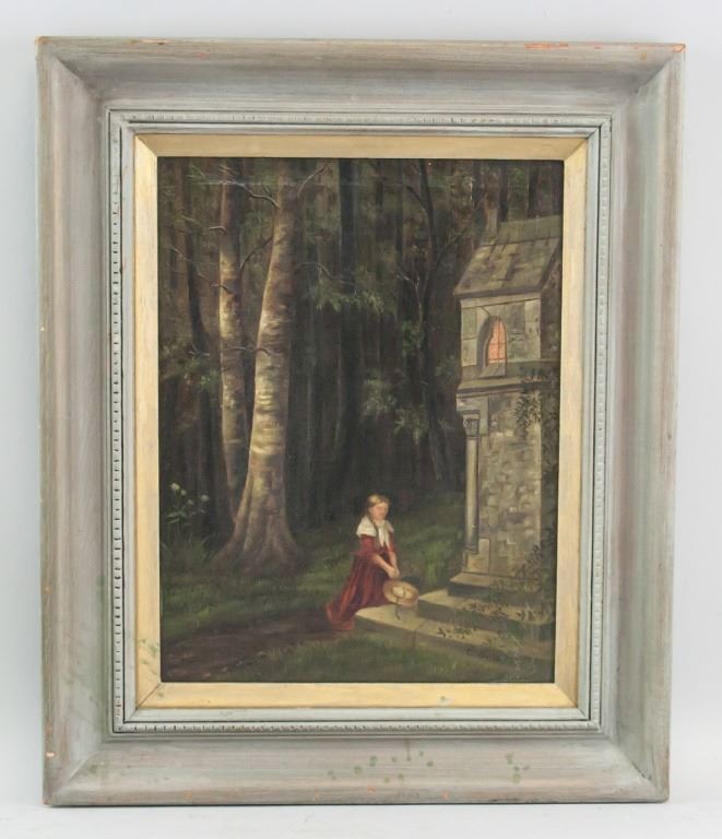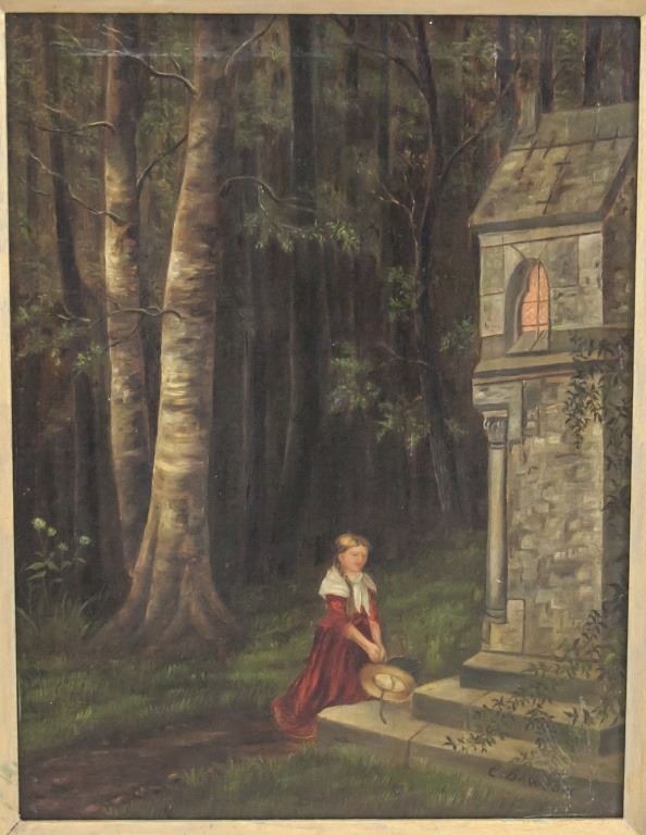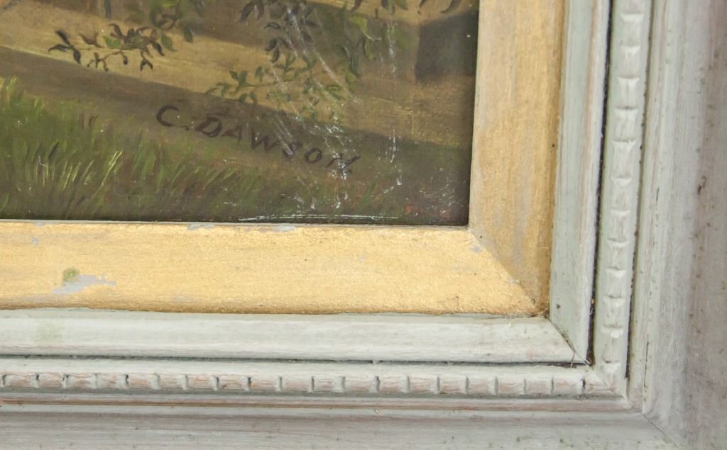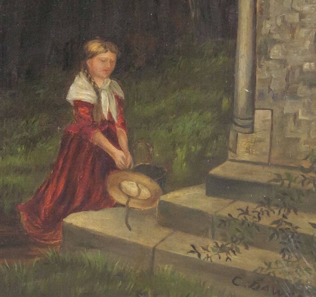 Oil on canvas, framed. Featuring a girl kneeling in front of a tomb. Signed "C. DAWSON" to the bottom right corner. Canvas size: 35 x 28 cm (13.5 x 11 inches). Frame size: 50 x 42 cm (19.5 x 16.5 inches).