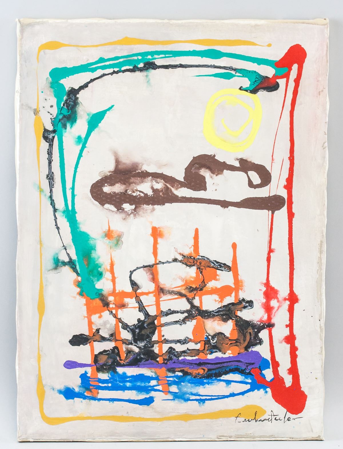 Oil on canvas. Featuring abstract composition of colorful lines against a white background. Signed "Frankenthaler" in the bottom right corner. 54 x 39 cm (21.25 x 15.5 in). Provenance: This lot carries limited provenance from a Southern Ontario estate