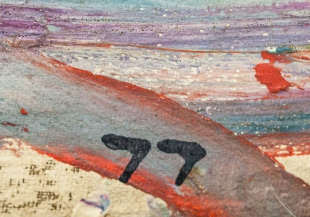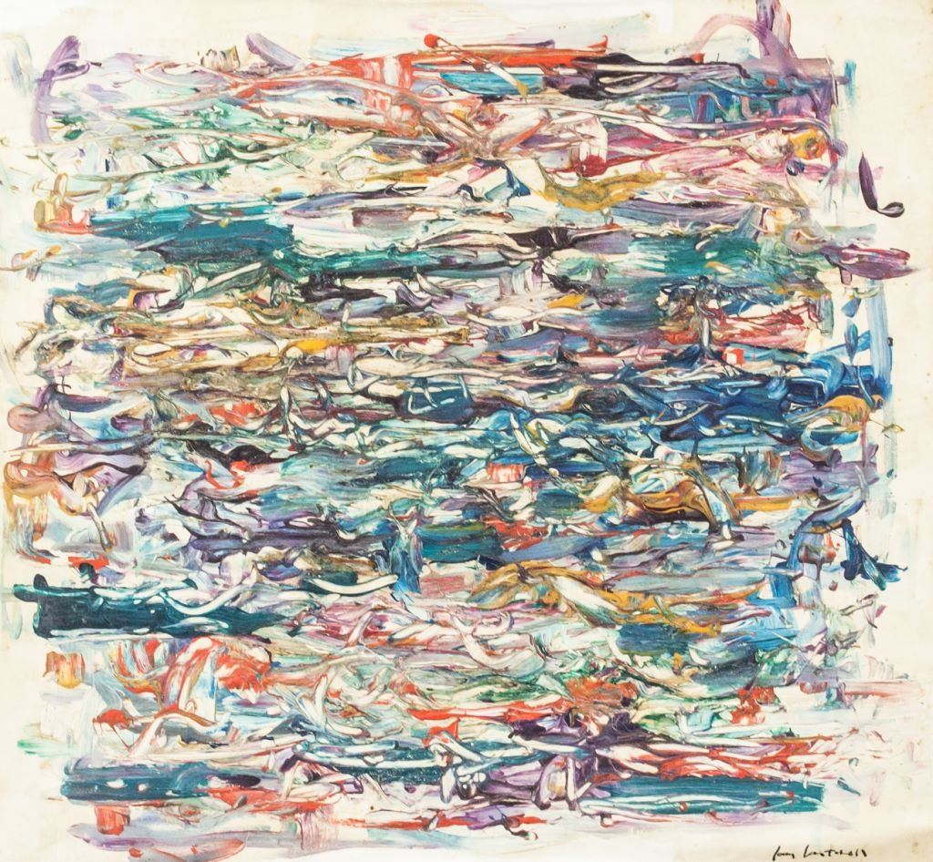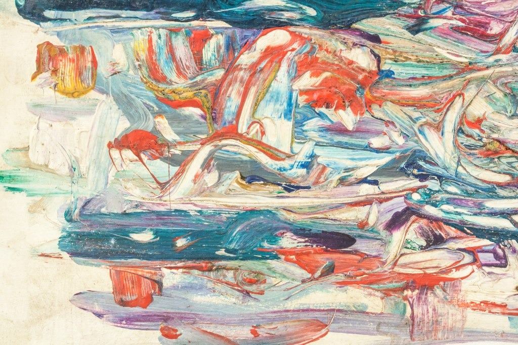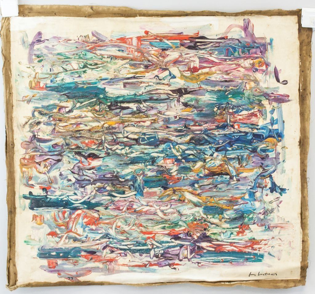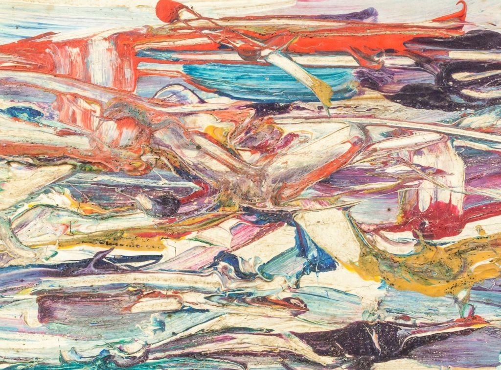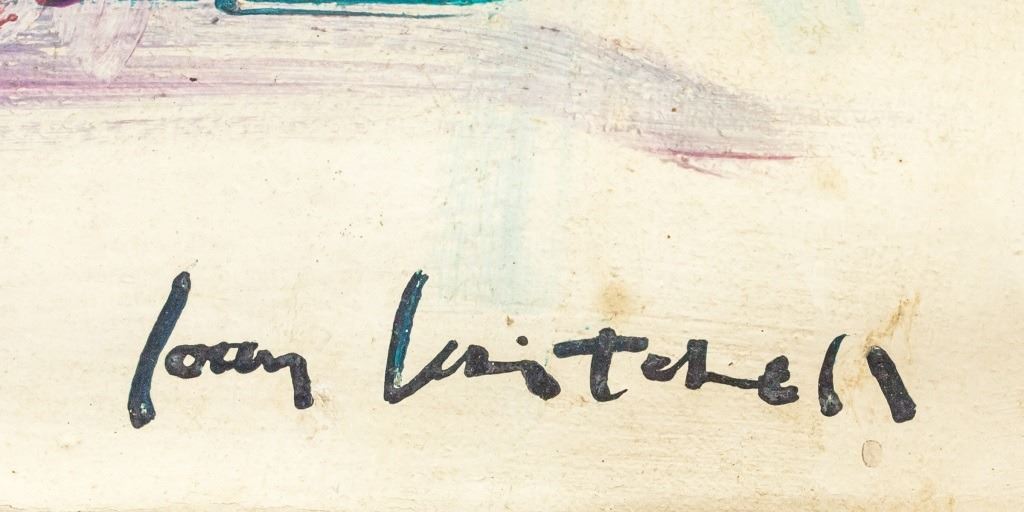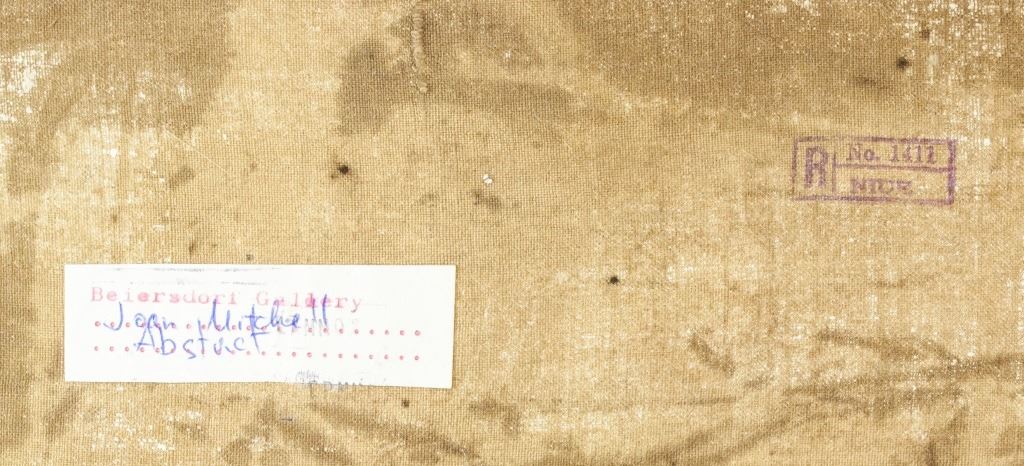 Oil on canvas. Featuring abstract composition. Signed "Joan Mitchell" to the bottom right corner. Label on verso reads "Beiersdorf Gallery / Joan Mitchell Abstract". Stamped with "R No. 1411 NTOE". 58 x 63 cm (23 x 25 in)