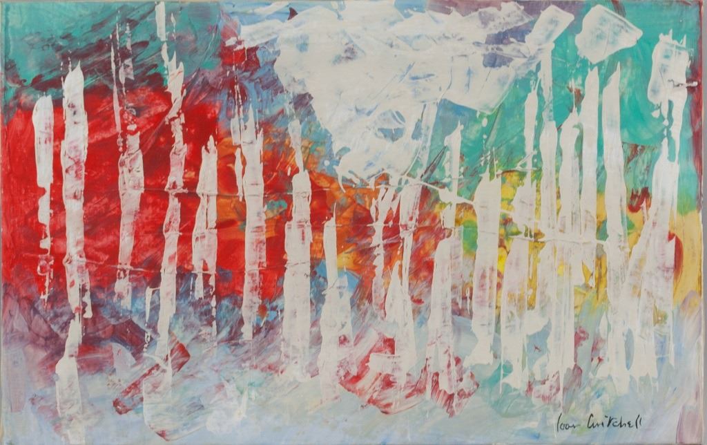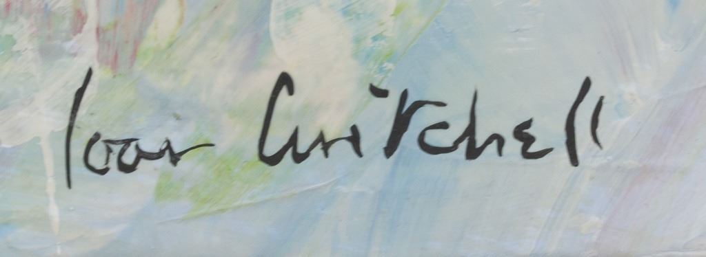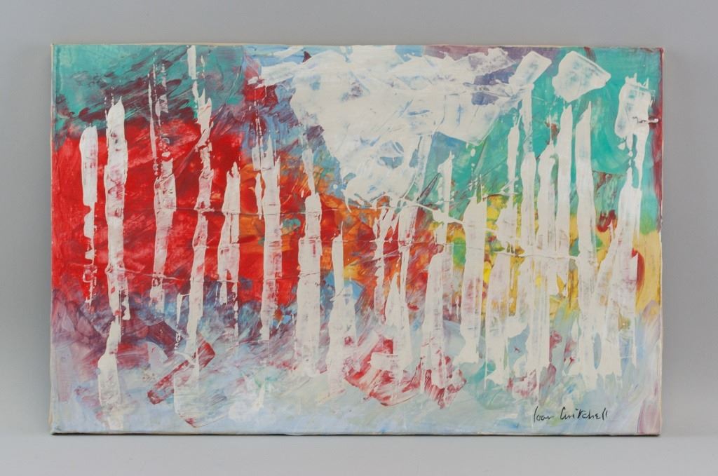 Oil on canvas. Featuring abstract composition of white lines against a multi-colored background. Signed "Joan Mitchell" to the bottom right corner. 36 x 57 cm (14 x 22.5 inches). Provenance: This lot carries limited provenance from a Southern Ontario estate