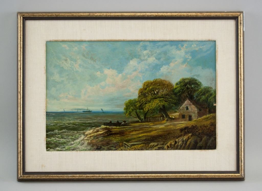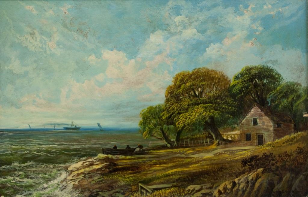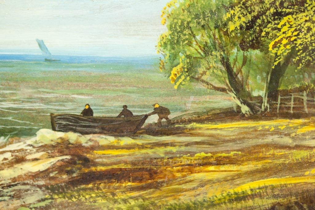 Oil on panel. Featuring landscape scene. Three figures are going out on a small boat. "CAPE WEST NOVA SCOTIA 94" inscribed to the bottom right. Canvas: 24 x 37 cm (9.5 x 14.5 inches). Frame: 37 x 49 cm (14.5 x 19 inches).